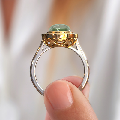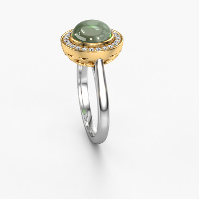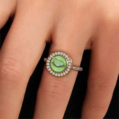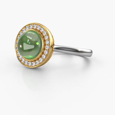 Wil je een mooie, royale ring met een enkele edelsteen als eyecatcher? Wat denk je dan van deze Alisa ring? De Alisa ring zie je hier afgebeeld in witgoud met een prachtige 8 mm ronde cabochon toermalijn groen. De toermalijn groen wordt met zeer zorgvuldig uitgezocht door onze leveranciers van toermalijn groen, en daarna volgens het oude ambacht door de goudsmid geplaatst in de ring. Deze wordt tot in het kleinste detail afgewerkt en gepolijst totdat een unieke ring is ontstaan met een prachtige toermalijn groen. Speciaal voor jou vervaardigd!Het mooiste cadeau wat je kunt geven, is een zelfontworpen fantasie ring. Ons team van gepassioneerde goudsmeden voegt iedere dag de mooiste nieuwe ontwerpen toe. En elk ontwerp kun je naar jouw wens aanpassen. Zo heb je de keuze welk edelmetaal gebruikt wordt, en kun je de kleur kiezen van de edelstenen. Zo wordt jouw fantasie Alisa ring ontwerp geheel uniek!Wil je jouw Alisa ring laten graveren, dan kun je dit doorgeven bij je bestelling. Wij zorgen ervoor dat je ring helemaal naar wens wordt vervaardigd. Ben je gebonden aan een bepaald budget? Neem gerust contact met ons op, we adviseren graag over alle mogelijkheden. Sowieso leveren wij alle ringen tegen een prijs die je nergens anders tegen komt, doordat we de ring pas vervaardigen wanneer je deze besteld. Hierdoor kunnen wij je een beste prijs garantie geven.Om het voor jou makkelijker te maken kun je ieder besteld sieraad binnen 30 dagen na aflevering eenvoudig weer retour sturen.Heb je vragen, dan kun je altijd een kijkje nemen bij onze veelgestelde vragen. Kom je er niet uit, of zie je het antwoord op je vraag er niet bij staan, neem dan gerust contact op met het DiamondsByMe team!