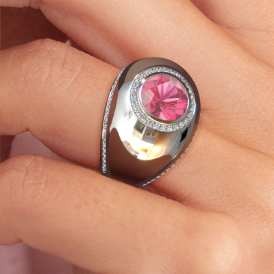Deze edelstenen witgouden ring Roxann is een prachtige ring. In de ring wordt speciaal geselecteerde roze saffier gezet. Een design ring, die getuigt van een vrouw met stijl. De ring is ontworpen door onze eigen juwelen designers. Doordat in ons