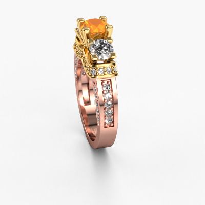 Deze verlovingsring heeft de naam Phileine. Deze gedurfde verlovingsring uitgevoerd, in 14 Carat rosé goud is gezet met 5 mm citrien. Deze exclusieve rosé gouden 3 steens verlovingsring is een puur staaltje vakmanschap! Alle kleine details zijn door onze goudsmid met veel geduld en passie vervaardigd. Dit ambacht vraagt een deskundig oog en vaardige hand om deze verlovingsring met uiterste precisie samen te stellen. En dat is precies waar onze goudsmeden enthousiast van worden! De prachtige citrien zijn op een bijzondere manier gezet, zodat deze nog beter tot zijn recht komen. Dit geeft de verlovingsring extra allure. De verlovingsring is al uniek door zijn natuurlijke edelsteen, die we speciaal geselecteerd hebben voor deze ring. Daarnaast kun je zelf de samenstelling kiezen van het edelmetaal, waardoor je uiteindelijk een unieke verlovingsring hebt gecreëerd voor de meest exclusieve vrouw in je leven! Dit juweel wordt met passie en liefde gemaakt door één van onze meestergoudsmeden.Wist je dat we een beste prijs garantie geven voor jouw verlovingsring? Dit is mogelijk omdat al onze sieraden met de hand gemaakt worden in ons eigen atelier. We hebben geen dure voorraden, en we maken pas je verlovingsring op het moment dat je besteld hebt. Doordat we de hele productie zelf in de hand hebben, kunnen wij je goed informeren over alle eigenschappen van deze ring. Juist omdat het kopen van een verlovingsring online spannend is, begrijpen wij dat het fijn is om alle kenmerken te weten van jouw ring.Ons team ontwerpt dagelijks nieuwe ringen in diverse stijlen. Heb je zelf een 3 steens verlovingsring ergens gezien, die jij het liefst aan jouw geliefde zou willen geven? Je kunt altijd jouw ideeën en ontwerp met onze sieradenontwerpers bespreken, want wij zetten graag jouw ontwerp om tot een exclusieve verlovingsring. Je kunt tijdens het ontwerpproces steeds meekijken, omdat het ontwerp in een zeer gedetailleerde 3D tekening wordt omgezet. Daarbij kun je een dummy bestellen van het uiteindelijke ontwerp. Een dummy is een kunststof ring, die precies dezelfde vormen heeft als jouw uiteindelijke ontwerp. Je kunt deze passen en zien of de ontworpen verlovingsring helemaal naar jouw wens is. Wij sturen je graag een vrijblijvende offerte, waarbij je ongetwijfeld versteld zult staan over de prijs en de kwaliteit van de ring en edelstenen.Om het voor jou makkelijker te maken kun je ieder besteld sieraad binnen 30 dagen na aflevering eenvoudig weer retour sturen.