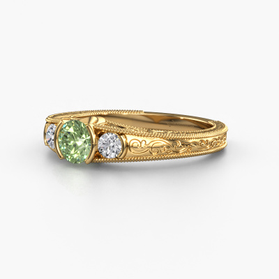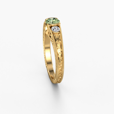 Deze promise ring heeft de naam Tasia. Deze filigraan promise ring uitgevoerd in 14 Carat goud is gezet met 5 mm groene lab grown diamant. Heeft jouw vriendin een zwak voor vintage? Dan kun je er vrijwel zeker van zijn dat deze gouden promise ring helemaal bij haar stijl zal passen! Een nieuw model, gebaseerd op vintage motieven. Ietwat dromerig, een prachtig ontwerp! Zeker als je deze nog verder aangepast naar jullie smaak. In deze vintage 3 steens promise ring zijn prachtige groene lab grown diamanten verwerkt. Zoals je ziet kun je zelf voor een edelsteen kiezen die jij bij je vriendin vindt passen. Iedere edelsteen wordt zorgvuldig geselecteerd bij onze handelaren wereldwijd, onze goudsmid wil alleen de mooiste edelstenen op een juweel verwerken. Het is immers de kroon op zijn werk! Ieder juweel wordt met passie en liefde gemaakt door één van onze meestergoudsmeden.Door het gebruik van de modernste technieken, gecombineerd met ambachtelijk vakmanschap kunnen wij alle promise ringen zelf in ons atelier maken. Ieder sieraad wordt pas gemaakt nadat deze besteld is. Dit heeft als bijkomend voordeel dat we kunnen leveren tegen een prijs die je nergens anders tegenkomt.Ons team is iedere dag weer bezig om nieuwe ontwerpen toe te voegen, in samenwerking met onze designers en goudsmeden wordt gekeken hoe we tot het mooiste ontwerp kunnen komen. Wij doen ons best om tot een zo gevarieerd mogelijk aanbod te komen. Wellicht heb je zelf al een mooi idee van een sieraad dat je ooit wel eens gezien hebt. Neem dan eens vrijblijvend contact met ons op. Wij maken een offerte voor je op waarbij wij vrij zeker zijn dat we wat betreft kwaliteit en prijs jou versteld zullen laten staan.Om het voor jou makkelijker te maken kun je ieder besteld sieraad binnen 30 dagen na aflevering eenvoudig weer retour sturen.