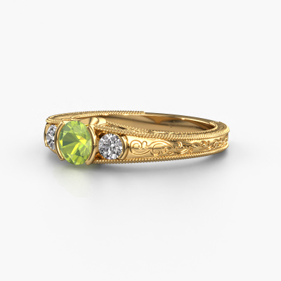 Deze promise ring heeft de naam Tasia. Deze filigraan promise ring uitgevoerd in 14 Carat goud is gezet met 5 mm peridoot. Heeft jouw vriendin een zwak voor vintage? Dan kun je er vrijwel zeker van zijn dat deze gouden promise ring helemaal bij haar stijl zal passen! Een nieuw model, gebaseerd op vintage motieven. Ietwat dromerig, een prachtig ontwerp! Zeker als je deze nog verder aangepast naar jullie smaak. In deze vintage 3 steens promise ring zijn prachtige peridoot verwerkt. Zoals je ziet kun je zelf voor een edelsteen kiezen die jij bij je vriendin vindt passen. Iedere edelsteen wordt zorgvuldig geselecteerd bij onze handelaren wereldwijd, onze goudsmid wil alleen de mooiste edelstenen op een juweel verwerken. Het is immers de kroon op zijn werk! Ieder juweel wordt met passie en liefde gemaakt door één van onze meestergoudsmeden.Door het gebruik van de modernste technieken, gecombineerd met ambachtelijk vakmanschap kunnen wij alle promise ringen zelf in ons atelier maken. Ieder sieraad wordt pas gemaakt nadat deze besteld is. Dit heeft als bijkomend voordeel dat we kunnen leveren tegen een prijs die je nergens anders tegenkomt.Ons team is iedere dag weer bezig om nieuwe ontwerpen toe te voegen, in samenwerking met onze designers en goudsmeden wordt gekeken hoe we tot het mooiste ontwerp kunnen komen. Wij doen ons best om tot een zo gevarieerd mogelijk aanbod te komen. Wellicht heb je zelf al een mooi idee van een sieraad dat je ooit wel eens gezien hebt. Neem dan eens vrijblijvend contact met ons op. Wij maken een offerte voor je op waarbij wij vrij zeker zijn dat we wat betreft kwaliteit en prijs jou versteld zullen laten staan.Om het voor jou makkelijker te maken kun je ieder besteld sieraad binnen 30 dagen na aflevering eenvoudig weer retour sturen.
