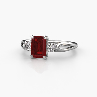 Deze verlovingsring heeft de naam Amie EME. Deze smaakvolle verlovingsring uitgevoerd, in platina is gezet met 7x5 mm robijn. Deze exclusieve platina 3 steens verlovingsring is een puur staaltje vakmanschap! Alle kleine details zijn door onze goudsmid met veel geduld en passie vervaardigd. Dit ambacht vraagt een deskundig oog en vaardige hand om deze verlovingsring met uiterste precisie samen te stellen. En dat is precies waar onze goudsmeden enthousiast van worden! De prachtige robijn zijn op een bijzondere manier gezet, zodat deze nog beter tot zijn recht komen. Dit geeft de verlovingsring extra allure. De verlovingsring is al uniek door zijn natuurlijke edelsteen, die we speciaal geselecteerd hebben voor deze ring. Daarnaast kun je zelf de samenstelling kiezen van het edelmetaal, waardoor je uiteindelijk een unieke verlovingsring hebt gecreëerd voor de meest exclusieve vrouw in je leven! Dit juweel is gemaakt om aan jouw vinger te stralen, ieder sieraad wordt met liefde door onze goudsmeden met de hand gemaakt.Wellicht is het je opgevallen dat onze prijzen gemiddeld 30% lager liggen dan bij een andere juwelier. En dat terwijl de kwaliteit in de meeste gevallen nog beter is! Dit komt doordat onze goudsmeden je verlovingsring direct in ons eigen atelier vervaardigen. Hierdoor hoeven we geen dure voorraden te hanteren en kunnen we ieder gewenst detail direct op jouw verlovingsring aanbrengen.Ons team is iedere dag weer bezig om nieuwe ontwerpen toe te voegen, in samenwerking met onze designers en goudsmeden wordt gekeken hoe we tot het mooiste ontwerp kunnen komen. Wij doen ons best om tot een zo gevarieerd mogelijk aanbod te komen. Wellicht heb je zelf al een mooi idee van een sieraad dat je ooit wel eens gezien hebt. Neem dan eens vrijblijvend contact met ons op. Wij maken een offerte voor je op waarbij wij vrij zeker zijn dat we wat betreft kwaliteit en prijs jou versteld zullen laten staan.Om het voor jou makkelijker te maken kun je ieder besteld sieraad binnen 30 dagen na aflevering eenvoudig weer retour sturen.