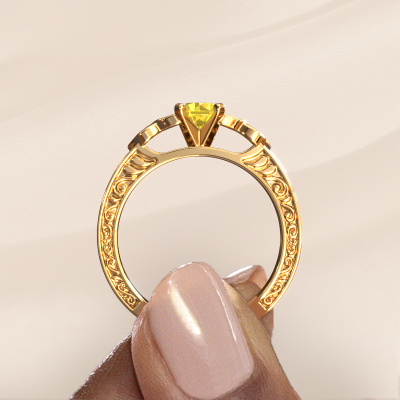 Deze verlovingsring heeft de naam Gillian. Deze opengewerkte verlovingsring uitgevoerd in 14 Carat goud is gezet met 5 mm gele saffier. Heeft jouw vriendin een zwak voor vintage? Dan kun je er vrijwel zeker van zijn dat deze gouden verlovingsring helemaal bij haar stijl zal passen! Een nieuw model, gebaseerd op vintage motieven. Ietwat dromerig, een prachtig ontwerp! Zeker als je deze nog verder aangepast naar jullie smaak. In deze vintage 3 steens verlovingsring zijn prachtige gele saffier verwerkt. Zoals je ziet kun je zelf voor een edelsteen kiezen die jij bij je vriendin vindt passen. Iedere edelsteen wordt zorgvuldig geselecteerd bij onze handelaren wereldwijd, onze goudsmid wil alleen de mooiste edelstenen op een juweel verwerken. Het is immers de kroon op zijn werk! Ieder juweel is speciaal voor jou gemaakt, met aandacht voor detail en design.Wist je dat we een beste prijs garantie geven voor jouw verlovingsring? Dit is mogelijk omdat al onze sieraden met de hand gemaakt worden in ons eigen atelier. We hebben geen dure voorraden, en we maken pas je verlovingsring op het moment dat je besteld hebt. Doordat we de hele productie zelf in de hand hebben, kunnen wij je goed informeren over alle eigenschappen van deze ring. Juist omdat het kopen van een verlovingsring online spannend is, begrijpen wij dat het fijn is om alle kenmerken te weten van jouw ring.Ons team ontwerpt dagelijks nieuwe ringen in diverse stijlen. Heb je zelf een 3 steens verlovingsring ergens gezien, die jij het liefst aan jouw geliefde zou willen geven? Je kunt altijd jouw ideeën en ontwerp met onze sieradenontwerpers bespreken, want wij zetten graag jouw ontwerp om tot een vintage verlovingsring. Je kunt tijdens het ontwerpproces steeds meekijken, omdat het ontwerp in een zeer gedetailleerde 3D tekening wordt omgezet. Daarbij kun je een dummy bestellen van het uiteindelijke ontwerp. Een dummy is een kunststof ring, die precies dezelfde vormen heeft als jouw uiteindelijke ontwerp. Je kunt deze passen en zien of de ontworpen verlovingsring helemaal naar jouw wens is. Wij sturen je graag een vrijblijvende offerte, waarbij je ongetwijfeld versteld zult staan over de prijs en de kwaliteit van de ring en edelstenen.Om het voor jou makkelijker te maken kun je ieder besteld sieraad binnen 30 dagen na aflevering eenvoudig weer retour sturen.