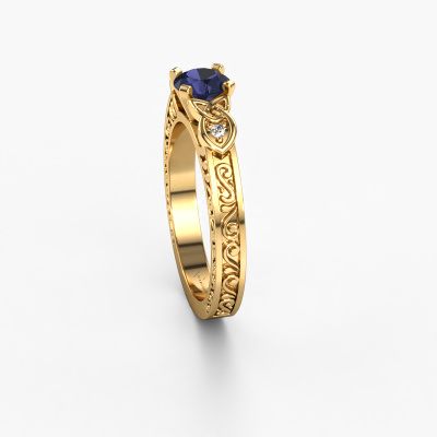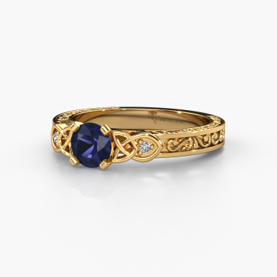 Deze verlovingsring heeft de naam Gillian. Deze opengewerkte verlovingsring uitgevoerd in 14 Carat goud is gezet met 5 mm saffier. Heeft jouw vriendin een zwak voor vintage? Dan kun je er vrijwel zeker van zijn dat deze gouden verlovingsring helemaal bij haar stijl zal passen! Een nieuw model, gebaseerd op vintage motieven. Ietwat dromerig, een prachtig ontwerp! Zeker als je deze nog verder aangepast naar jullie smaak. In deze vintage 3 steens verlovingsring zijn prachtige saffier verwerkt. Zoals je ziet kun je zelf voor een edelsteen kiezen die jij bij je vriendin vindt passen. Iedere edelsteen wordt zorgvuldig geselecteerd bij onze handelaren wereldwijd, onze goudsmid wil alleen de mooiste edelstenen op een juweel verwerken. Het is immers de kroon op zijn werk! Ieder juweel is speciaal voor jou gemaakt, met aandacht voor detail en design.Wist je dat we een beste prijs garantie geven voor jouw verlovingsring? Dit is mogelijk omdat al onze sieraden met de hand gemaakt worden in ons eigen atelier. We hebben geen dure voorraden, en we maken pas je verlovingsring op het moment dat je besteld hebt. Doordat we de hele productie zelf in de hand hebben, kunnen wij je goed informeren over alle eigenschappen van deze ring. Juist omdat het kopen van een verlovingsring online spannend is, begrijpen wij dat het fijn is om alle kenmerken te weten van jouw ring.Ons team ontwerpt dagelijks nieuwe ringen in diverse stijlen. Heb je zelf een 3 steens verlovingsring ergens gezien, die jij het liefst aan jouw geliefde zou willen geven? Je kunt altijd jouw ideeën en ontwerp met onze sieradenontwerpers bespreken, want wij zetten graag jouw ontwerp om tot een vintage verlovingsring. Je kunt tijdens het ontwerpproces steeds meekijken, omdat het ontwerp in een zeer gedetailleerde 3D tekening wordt omgezet. Daarbij kun je een dummy bestellen van het uiteindelijke ontwerp. Een dummy is een kunststof ring, die precies dezelfde vormen heeft als jouw uiteindelijke ontwerp. Je kunt deze passen en zien of de ontworpen verlovingsring helemaal naar jouw wens is. Wij sturen je graag een vrijblijvende offerte, waarbij je ongetwijfeld versteld zult staan over de prijs en de kwaliteit van de ring en edelstenen.Om het voor jou makkelijker te maken kun je ieder besteld sieraad binnen 30 dagen na aflevering eenvoudig weer retour sturen.