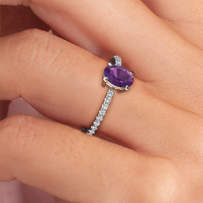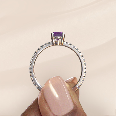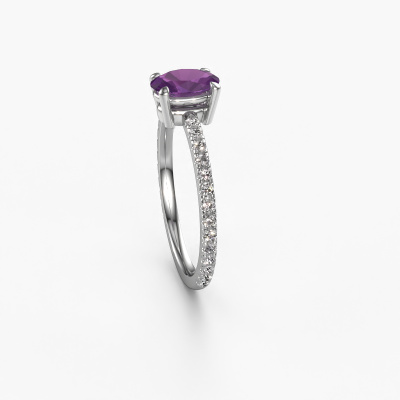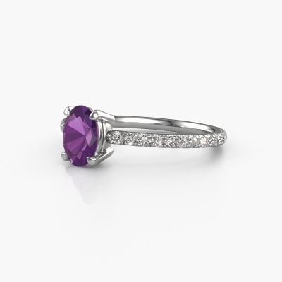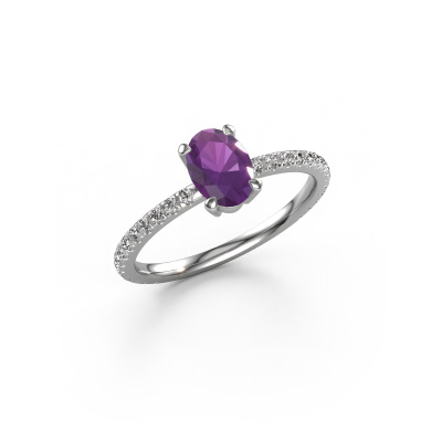 Bovenstaande verlovingsring heeft de naam Lynelle 2. Dit type verlovingsring noemen we een pavé solitaire verlovingsring omdat hij een enkele middensteen heeft waarbij de banden van de verlovingsring ook volgezet zijn. Deze verlovingsring is uitgevoerd in platina en heeft als middensteen een ovale amethist ter grootte van 7x5 mm, en in de zijbanden zijn diamanten gezet. Ieder juweel is gemaakt om aan je vinger te stralen, ieder sieraad wordt met liefde door onze goudsmeden met de hand gemaakt.. Deze klassieke platina pavé solitaire verlovingsring heeft een schitterende ovale amethist als center steen, waarbij in de band nog meer diamanten zijn gezet om de middensteen nog meer te accentueren. Doordat de zetting van de pootjes om de amethist open is, vangt de amethist het licht van alle kanten op en schittert hierdoor optimaal. Hierboven kun je zien hoe onze goudsmid de verlovingsring heel precies tot in de kleinste details heeft bewerkt, zodat de wat hoger gelegen amethist een echte eyecatcher is. Wat een prachtige verlovingsring om te geven bij je aanzoek aan de liefde van jouw leven, aan jouw stralende middelpunt!Onze goudsmeden vervaardigen pas je Lynelle 2 verlovingsring, zodra je deze besteld hebt. We hebben geen voorraden. Het voordeel hiervan is dat we de voorraad niet door hoeven te berekenen in de prijs, en kunnen daardoor sieraden leveren tegen een bijzonder lage prijs.Heb je zelf een speciale ring in gedachten, die je wellicht ergens gezien hebt? Je kunt je ideeën altijd met ons bespreken, wij zetten graag jouw ontwerp om tot een unieke verlovingsring. Het ontwerp kun je volgen, omdat wij met 3D tekeningen werken. Hierdoor krijg je al een realistische indruk van hoe jouw ontwerp er in het echt uit komt te zien. Wij sturen je graag een vrijblijvende offerte, waarbij je ongetwijfeld verwonderd zult zijn over de prijs in combinatie met de uitstekende kwaliteit die we aanbieden.Om het voor jou makkelijker te maken kun je ieder besteld sieraad binnen 30 dagen na aflevering eenvoudig weer retour sturen.