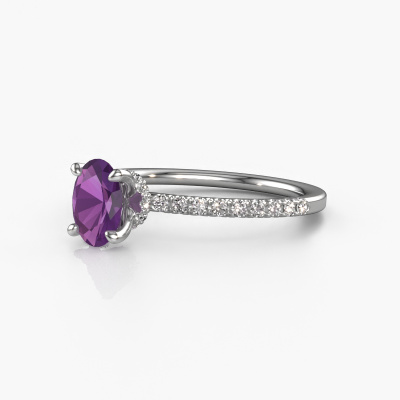 Bovenstaande verlovingsring heeft de naam Crystal OVL 4. Dit type verlovingsring noemen we een pavé solitaire verlovingsring omdat hij een enkele middensteen heeft waarbij de banden van de verlovingsring ook volgezet zijn. De verlovingsring is uitgevoerd in de combinatie platina met platina en heeft als middensteen een ovale amethist ter grootte van 7x5 mm en in de zijbanden zijn diamanten gezet. Ieder juweel wordt met passie en liefde gemaakt door één van onze meestergoudsmeden.Deze eigentijdse platina pavé solitaire verlovingsring heeft een schitterende ovale amethist als centersteen, waarbij in de band nog meer amethisten zijn gezet om de middensteen nog meer te accentueren. Doordat de zetting van de pootjes om de amethist open is, vangt de amethist het licht van alle kanten op en schittert hierdoor optimaal. Hierboven kun je zien hoe onze goudsmid de verlovingsring heel precies tot in de kleinste details heeft bewerkt, zodat de wat hoger gelegen amethist een echte eyecatcher is. Wat een prachtige verlovingsring om te geven bij je aanzoek aan de liefde van jouw leven, aan jouw stralende middelpunt!Wist je dat we een beste prijs garantie geven voor jouw verlovingsring? Dit is mogelijk omdat al onze sieraden met de hand gemaakt worden in ons eigen atelier. We hebben geen dure voorraden, en we maken pas je verlovingsring op het moment dat je besteld hebt. Doordat we de hele productie zelf in de hand hebben, kunnen wij je goed informeren over alle eigenschappen van deze ring. Juist omdat het kopen van een verlovingsring online spannend is, begrijpen wij dat het fijn is om alle kenmerken te weten van jouw ring.Ons team is iedere dag weer bezig om nieuwe ontwerpen toe te voegen, in samenwerking met onze designers en goudsmeden wordt gekeken hoe we tot het mooiste ontwerp kunnen komen. Wij doen ons best om tot een zo gevarieerd mogelijk aanbod te komen. Wellicht heb je zelf al een mooi idee van een sieraad dat je ooit wel eens gezien hebt. Neem dan eens vrijblijvend contact met ons op. Wij maken een offerte voor je op waarbij wij vrij zeker zijn dat we wat betreft kwaliteit en prijs jou versteld zullen laten staan.Om het voor jou makkelijker te maken kun je ieder besteld sieraad binnen 30 dagen na aflevering eenvoudig weer retour sturen.