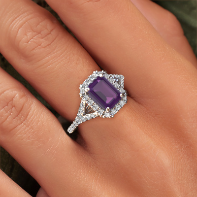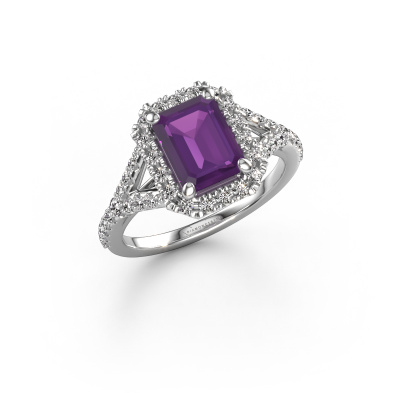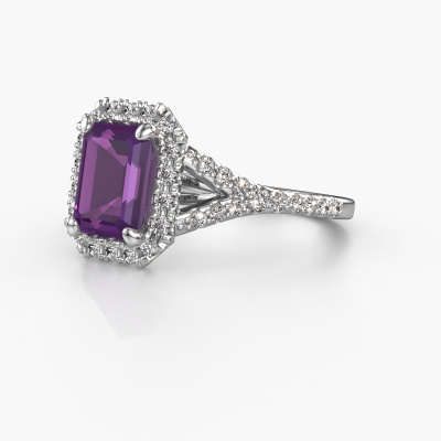 Bovenstaande verlovingsring heeft de naam Kimber EME. Dit type verlovingsring noemen we een pavé solitaire verlovingsring omdat hij een enkele middensteen heeft waarbij de banden van de verlovingsring ook volgezet zijn. De verlovingsring is uitgevoerd in de combinatie platina met platina en heeft als middensteen een smaragd geslepen amethist ter grootte van 8x6 mm en in de zijbanden zijn lab-grown diamanten gezet. Ieder juweel is gemaakt door een team van gedreven goudsmeden en designers. Hierdoor zal dit unieke pronkstuk een echte eyecatcher zijn.Deze exclusieve platina pavé solitaire verlovingsring heeft een schitterende smaragd geslepen amethist als centersteen, waarbij in de band nog meer amethisten zijn gezet om de middensteen nog meer te accentueren. Doordat de zetting van de pootjes om de amethist open is, vangt de amethist het licht van alle kanten op en schittert hierdoor optimaal. Hierboven kun je zien hoe onze goudsmid de verlovingsring heel precies tot in de kleinste details heeft bewerkt, zodat de wat hoger gelegen amethist een echte eyecatcher is. Wat een prachtige verlovingsring om te geven bij je aanzoek aan de liefde van jouw leven, aan jouw stralende middelpunt!Door het gebruik van de modernste technieken, gecombineerd met ambachtelijk vakmanschap kunnen wij alle verlovingsringen zelf in ons atelier maken. Ieder sieraad wordt pas gemaakt nadat deze besteld is. Dit heeft als bijkomend voordeel dat we kunnen leveren tegen een prijs die je nergens anders tegenkomt.Ons team is iedere dag weer bezig om nieuwe ontwerpen toe te voegen, in samenwerking met onze designers en goudsmeden wordt gekeken hoe we tot het mooiste ontwerp kunnen komen. Wij doen ons best om tot een zo gevarieerd mogelijk aanbod te komen. Wellicht heb je zelf al een mooi idee van een sieraad dat je ooit wel eens gezien hebt. Neem dan eens vrijblijvend contact met ons op. Wij maken een offerte voor je op waarbij wij vrij zeker zijn dat we wat betreft kwaliteit en prijs jou versteld zullen laten staan.Om het voor jou makkelijker te maken kun je ieder besteld sieraad binnen 30 dagen na aflevering eenvoudig weer retour sturen.