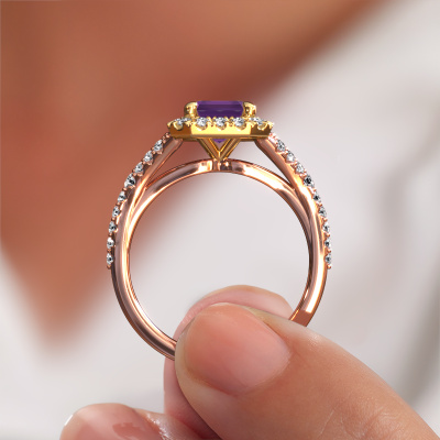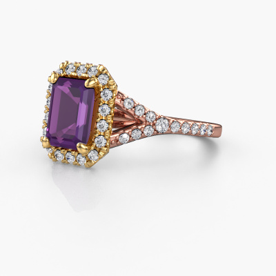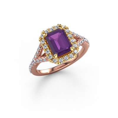Bovenstaande verlovingsring heeft de naam Kimber EME. Dit type verlovingsring noemen we een pavé solitaire verlovingsring omdat hij een enkele middensteen heeft waarbij de banden van de verlovingsring ook volgezet zijn. De verlovingsring is uitgevoerd in de combinatie 14 Carat rosé goud met goud en heeft als middensteen een smaragd geslepen amethist ter grootte van 8x6 mm en in de zijbanden zijn lab-grown diamanten gezet. Ieder juweel is gemaakt door een team van gedreven goudsmeden en designers. Hierdoor zal dit unieke pronkstuk een echte eyecatcher zijn.Deze exclusieve rosé gouden pavé solitaire verlovingsring heeft een schitterende smaragd geslepen amethist als centersteen, waarbij in de band nog meer amethisten zijn gezet om de middensteen nog meer te accentueren. Doordat de zetting van de pootjes om de amethist open is, vangt de amethist het licht van alle kanten op en schittert hierdoor optimaal. Hierboven kun je zien hoe onze goudsmid de verlovingsring heel precies tot in de kleinste details heeft bewerkt, zodat de wat hoger gelegen amethist een echte eyecatcher is. Wat een prachtige verlovingsring om te geven bij je aanzoek aan de liefde van jouw leven, aan jouw stralende middelpunt!Door het gebruik van de modernste technieken, gecombineerd met ambachtelijk vakmanschap kunnen wij alle verlovingsringen zelf in ons atelier maken. Ieder sieraad wordt pas gemaakt nadat deze besteld is. Dit heeft als bijkomend voordeel dat we kunnen leveren tegen een prijs die je nergens anders tegenkomt.Ons team is iedere dag weer bezig om nieuwe ontwerpen toe te voegen, in samenwerking met onze designers en goudsmeden wordt gekeken hoe we tot het mooiste ontwerp kunnen komen. Wij doen ons best om tot een zo gevarieerd mogelijk aanbod te komen. Wellicht heb je zelf al een mooi idee van een sieraad dat je ooit wel eens gezien hebt. Neem dan eens vrijblijvend contact met ons op. Wij maken een offerte voor je op waarbij wij vrij zeker zijn dat we wat betreft kwaliteit en prijs jou versteld zullen laten staan.Om het voor jou makkelijker te maken kun je ieder besteld sieraad binnen 30 dagen na aflevering eenvoudig weer retour sturen.