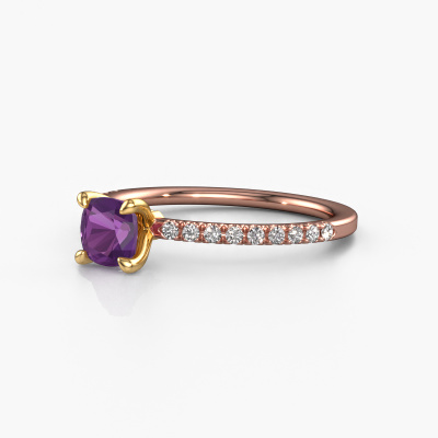 Bovenstaande verlovingsring heeft de naam Crystal CUS 2. Dit type verlovingsring noemen we een pavé solitaire verlovingsring omdat hij een enkele middensteen heeft waarbij de banden van de verlovingsring ook volgezet zijn. De verlovingsring is uitgevoerd in de combinatie 14 Carat rosé goud met goud en heeft als middensteen een cushion amethist ter grootte van 5 mm en in de zijbanden zijn diamanten gezet. Ieder juweel wordt speciaal voor jou gemaakt door onze meester goudsmeden in ons eigen atelier.Deze klassieke rosé gouden pavé solitaire verlovingsring heeft een schitterende cushion amethist als centersteen, waarbij in de band nog meer amethisten zijn gezet om de middensteen nog meer te accentueren. Doordat de zetting van de pootjes om de amethist open is, vangt de amethist het licht van alle kanten op en schittert hierdoor optimaal. Hierboven kun je zien hoe onze goudsmid de verlovingsring heel precies tot in de kleinste details heeft bewerkt, zodat de wat hoger gelegen amethist een echte eyecatcher is. Wat een prachtige verlovingsring om te geven bij je aanzoek aan de liefde van jouw leven, aan jouw stralende middelpunt!Onze goudsmeden vervaardigen pas je Crystal CUS 2 verlovingsring, zodra je deze besteld hebt. We hebben geen voorraden. Het voordeel hiervan is dat we de voorraad niet door hoeven te berekenen in de prijs, en kunnen daardoor sieraden leveren tegen een bijzonder lage prijs.Ons team ontwerpt dagelijks nieuwe ringen in diverse stijlen. Heb je zelf een pavé solitaire verlovingsring ergens gezien, die jij het liefst aan jouw geliefde zou willen geven? Je kunt altijd jouw ideeën en ontwerp met onze sieradenontwerpers bespreken, want wij zetten graag jouw ontwerp om tot een klassieke verlovingsring. Je kunt tijdens het ontwerpproces steeds meekijken, omdat het ontwerp in een zeer gedetailleerde 3D tekening wordt omgezet. Daarbij kun je een dummy bestellen van het uiteindelijke ontwerp. Een dummy is een kunststof ring, die precies dezelfde vormen heeft als jouw uiteindelijke ontwerp. Je kunt deze passen en zien of de ontworpen verlovingsring helemaal naar jouw wens is. Wij sturen je graag een vrijblijvende offerte, waarbij je ongetwijfeld versteld zult staan over de prijs en de kwaliteit van de ring en edelstenen.Om het voor jou makkelijker te maken kun je ieder besteld sieraad binnen 30 dagen na aflevering eenvoudig weer retour sturen.