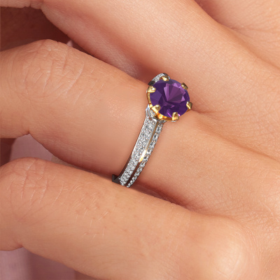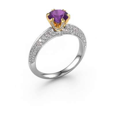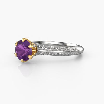 Bovenstaande verlovingsring heeft de naam Abby. Dit type verlovingsring noemen we een pavé solitaire verlovingsring omdat hij een enkele middensteen heeft waarbij de banden van de verlovingsring ook volgezet zijn. De verlovingsring is uitgevoerd in de combinatie 14 Carat witgoud met goud en heeft als middensteen een ronde amethist ter grootte van 6.5 mm en in de zijbanden zijn diamanten gezet. Ieder juweel wordt speciaal voor jou gemaakt door onze meester goudsmeden in ons eigen atelier.Deze exclusieve witgouden pavé solitaire verlovingsring heeft een schitterende ronde amethist als centersteen, waarbij in de band nog meer amethisten zijn gezet om de middensteen nog meer te accentueren. Doordat de zetting van de pootjes om de amethist open is, vangt de amethist het licht van alle kanten op en schittert hierdoor optimaal. Hierboven kun je zien hoe onze goudsmid de verlovingsring heel precies tot in de kleinste details heeft bewerkt, zodat de wat hoger gelegen amethist een echte eyecatcher is. Wat een prachtige verlovingsring om te geven bij je aanzoek aan de liefde van jouw leven, aan jouw stralende middelpunt!Wellicht is het je opgevallen dat onze prijzen gemiddeld 30% lager liggen dan bij een andere juwelier. En dat terwijl de kwaliteit in de meeste gevallen nog beter is! Dit komt doordat onze goudsmeden je verlovingsring direct in ons eigen atelier vervaardigen. Hierdoor hoeven we geen dure voorraden te hanteren en kunnen we ieder gewenst detail direct op jouw verlovingsring aanbrengen.Ons team is iedere dag weer bezig om nieuwe ontwerpen toe te voegen, in samenwerking met onze designers en goudsmeden wordt gekeken hoe we tot het mooiste ontwerp kunnen komen. Wij doen ons best om tot een zo gevarieerd mogelijk aanbod te komen. Wellicht heb je zelf al een mooi idee van een sieraad dat je ooit wel eens gezien hebt. Neem dan eens vrijblijvend contact met ons op. Wij maken een offerte voor je op waarbij wij vrij zeker zijn dat we wat betreft kwaliteit en prijs jou versteld zullen laten staan.Om het voor jou makkelijker te maken kun je ieder besteld sieraad binnen 30 dagen na aflevering eenvoudig weer retour sturen.