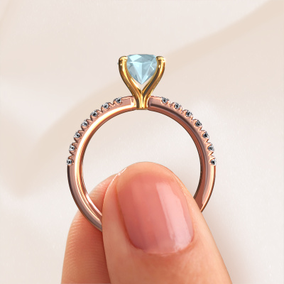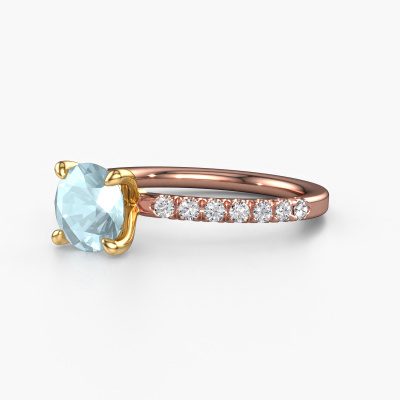 Bovenstaande verlovingsring heeft de naam Crystal RND 2. Dit type verlovingsring noemen we een pavé solitaire verlovingsring omdat hij een enkele middensteen heeft waarbij de banden van de verlovingsring ook volgezet zijn. De verlovingsring is uitgevoerd in de combinatie 14 Carat rosé goud met goud en heeft als middensteen een ronde aquamarijn ter grootte van 7 mm en in de zijbanden zijn lab-grown diamanten gezet. Ieder juweel is uniek, doordat je deze ring geheel naar eigen wensen kunt samenstellen.Deze klassieke rosé gouden pavé solitaire verlovingsring heeft een schitterende ronde aquamarijn als centersteen, waarbij in de band nog meer aquamarijn zijn gezet om de middensteen nog meer te accentueren. Doordat de zetting van de pootjes om de aquamarijn open is, vangt de aquamarijn het licht van alle kanten op en schittert hierdoor optimaal. Hierboven kun je zien hoe onze goudsmid de verlovingsring heel precies tot in de kleinste details heeft bewerkt, zodat de wat hoger gelegen aquamarijn een echte eyecatcher is. Wat een prachtige verlovingsring om te geven bij je aanzoek aan de liefde van jouw leven, aan jouw stralende middelpunt!Onze goudsmeden vervaardigen pas je Crystal RND 2 verlovingsring, zodra je deze besteld hebt. We hebben geen voorraden. Het voordeel hiervan is dat we de voorraad niet door hoeven te berekenen in de prijs, en kunnen daardoor sieraden leveren tegen een bijzonder lage prijs.Ons team ontwerpt dagelijks nieuwe ringen in diverse stijlen. Heb je zelf een pavé solitaire verlovingsring ergens gezien, die jij het liefst aan jouw geliefde zou willen geven? Je kunt altijd jouw ideeën en ontwerp met onze sieradenontwerpers bespreken, want wij zetten graag jouw ontwerp om tot een klassieke verlovingsring. Je kunt tijdens het ontwerpproces steeds meekijken, omdat het ontwerp in een zeer gedetailleerde 3D tekening wordt omgezet. Daarbij kun je een dummy bestellen van het uiteindelijke ontwerp. Een dummy is een kunststof ring, die precies dezelfde vormen heeft als jouw uiteindelijke ontwerp. Je kunt deze passen en zien of de ontworpen verlovingsring helemaal naar jouw wens is. Wij sturen je graag een vrijblijvende offerte, waarbij je ongetwijfeld versteld zult staan over de prijs en de kwaliteit van de ring en edelstenen.Om het voor jou makkelijker te maken kun je ieder besteld sieraad binnen 30 dagen na aflevering eenvoudig weer retour sturen.
