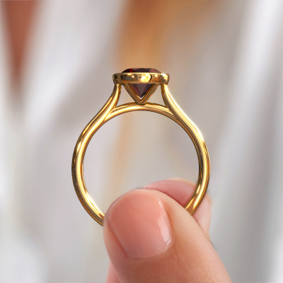Deze verlovingsring heeft de naam Lavon OVL. Deze strakke verlovingsring uitgevoerd, in 14 Carat goud is gezet met 9x7 mm granaat. Deze exclusieve gouden bezel zetting verlovingsring is een puur staaltje vakmanschap! Alle kleine details zijn door onze goudsmid met veel geduld en passie vervaardigd. Dit ambacht vraagt een deskundig oog en vaardige hand om deze verlovingsring met uiterste precisie samen te stellen. En dat is precies waar onze goudsmeden enthousiast van worden! De prachtige granaat zijn op een bijzondere manier gezet, zodat deze nog beter tot zijn recht komen. Dit geeft de verlovingsring extra allure. De verlovingsring is al uniek door zijn natuurlijke edelsteen, die we speciaal geselecteerd hebben voor deze ring. Daarnaast kun je zelf de samenstelling kiezen van het edelmetaal, waardoor je uiteindelijk een unieke verlovingsring hebt gecreëerd voor de meest exclusieve vrouw in je leven! Dit juweel is gemaakt om aan je vinger te stralen, ieder sieraad wordt met liefde door onze goudsmeden met de hand gemaakt.Door onze modernste technieken kunnen wij met uiterste precisie prachtige sieraden te ontwerpen en voor jou personaliseren in de hoogste juwelierskwaliteit. Tegelijkertijd zijn onze verlovingsringen altijd 30% goedkoper dan bij een andere juwelier. Dit komt doordat alle verlovingsringen pas vervaardigd worden op het moment dat deze besteld wordt en we daardoor geen dure voorraden hoeven te hanteren. Mocht je aan een bepaald budget gebonden zijn, kunnen we je graag adviseren welke combinatie je het beste kunt kiezen.Ons team is iedere dag weer bezig om nieuwe ontwerpen toe te voegen, in samenwerking met onze designers en goudsmeden wordt gekeken hoe we tot het mooiste ontwerp kunnen komen. Wij doen ons best om tot een zo gevarieerd mogelijk aanbod te komen. Wellicht heb je zelf al een mooi idee van een sieraad dat je ooit wel eens gezien hebt. Neem dan eens vrijblijvend contact met ons op. Wij maken een offerte voor je op waarbij wij vrij zeker zijn dat we wat betreft kwaliteit en prijs jou versteld zullen laten staan.Om het voor jou makkelijker te maken kun je ieder besteld sieraad binnen 30 dagen na aflevering eenvoudig weer retour sturen.