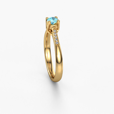 Bovenstaande promise ring heeft de naam Janna 2. Dit type promise ring noemen we een pavé solitaire promise ring omdat hij een enkele middensteen heeft waarbij de banden van de promise ring ook volgezet zijn. Deze promise ring is uitgevoerd in 14 Carat goud en heeft als middensteen een ronde blauw topaas ter grootte van 4 mm, en in de zijbanden zijn diamanten gezet. Ieder juweel wordt speciaal voor jou gemaakt door onze meester goudsmeden in ons eigen atelier.. Deze klassieke gouden pavé solitaire promise ring heeft een schitterende ronde blauw topaas als center steen, waarbij in de band nog meer diamanten zijn gezet om de middensteen nog meer te accentueren. Doordat de zetting van de pootjes om de blauw topaas open is, vangt de blauw topaas het licht van alle kanten op en schittert hierdoor optimaal. Hierboven kun je zien hoe onze goudsmid de promise ring heel precies tot in de kleinste details heeft bewerkt, zodat de wat hoger gelegen blauw topaas een echte eyecatcher is. Wat een prachtige promise ring om te geven bij je aanzoek aan de liefde van jouw leven, aan jouw stralende middelpunt!Door het gebruik van de modernste technieken, gecombineerd met ambachtelijk vakmanschap kunnen wij alle promise ringen zelf in ons atelier maken. Ieder sieraad wordt pas gemaakt nadat deze besteld is. Dit heeft als bijkomend voordeel dat we kunnen leveren tegen een prijs die je nergens anders tegenkomt.Heb je zelf een speciale ring in gedachten, die je wellicht ergens gezien hebt? Je kunt je ideeën altijd met ons bespreken, wij zetten graag jouw ontwerp om tot een unieke promise ring. Het ontwerp kun je volgen, omdat wij met 3D tekeningen werken. Hierdoor krijg je al een realistische indruk van hoe jouw ontwerp er in het echt uit komt te zien. Wij sturen je graag een vrijblijvende offerte, waarbij je ongetwijfeld verwonderd zult zijn over de prijs in combinatie met de uitstekende kwaliteit die we aanbieden.Om het voor jou makkelijker te maken kun je ieder besteld sieraad binnen 30 dagen na aflevering eenvoudig weer retour sturen.