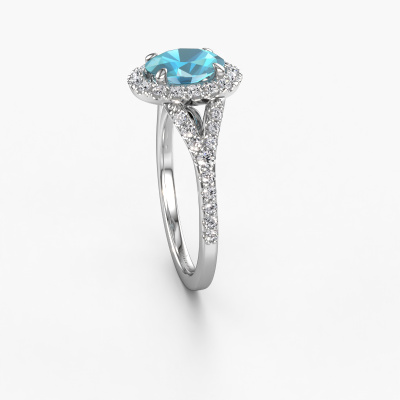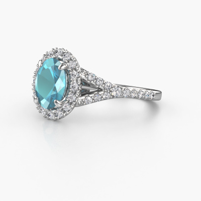 Bovenstaande verlovingsring heeft de naam Kimber OVL. Dit type verlovingsring noemen we een pavé solitaire verlovingsring omdat hij een enkele middensteen heeft waarbij de banden van de verlovingsring ook volgezet zijn. De verlovingsring is uitgevoerd in de combinatie platina met platina en heeft als middensteen een ovale blauw topaas ter grootte van 8x6 mm en in de zijbanden zijn lab-grown diamanten gezet. Ieder juweel wordt met passie en liefde gemaakt door één van onze meestergoudsmeden.Deze exclusieve platina pavé solitaire verlovingsring heeft een schitterende ovale blauw topaas als centersteen, waarbij in de band nog meer blauw topaas zijn gezet om de middensteen nog meer te accentueren. Doordat de zetting van de pootjes om de blauw topaas open is, vangt de blauw topaas het licht van alle kanten op en schittert hierdoor optimaal. Hierboven kun je zien hoe onze goudsmid de verlovingsring heel precies tot in de kleinste details heeft bewerkt, zodat de wat hoger gelegen blauw topaas een echte eyecatcher is. Wat een prachtige verlovingsring om te geven bij je aanzoek aan de liefde van jouw leven, aan jouw stralende middelpunt!Door het gebruik van de modernste technieken, gecombineerd met ambachtelijk vakmanschap kunnen wij alle verlovingsringen zelf in ons atelier maken. Ieder sieraad wordt pas gemaakt nadat deze besteld is. Dit heeft als bijkomend voordeel dat we kunnen leveren tegen een prijs die je nergens anders tegenkomt.Ons team is iedere dag weer bezig om nieuwe ontwerpen toe te voegen, in samenwerking met onze designers en goudsmeden wordt gekeken hoe we tot het mooiste ontwerp kunnen komen. Wij doen ons best om tot een zo gevarieerd mogelijk aanbod te komen. Wellicht heb je zelf al een mooi idee van een sieraad dat je ooit wel eens gezien hebt. Neem dan eens vrijblijvend contact met ons op. Wij maken een offerte voor je op waarbij wij vrij zeker zijn dat we wat betreft kwaliteit en prijs jou versteld zullen laten staan.Om het voor jou makkelijker te maken kun je ieder besteld sieraad binnen 30 dagen na aflevering eenvoudig weer retour sturen.