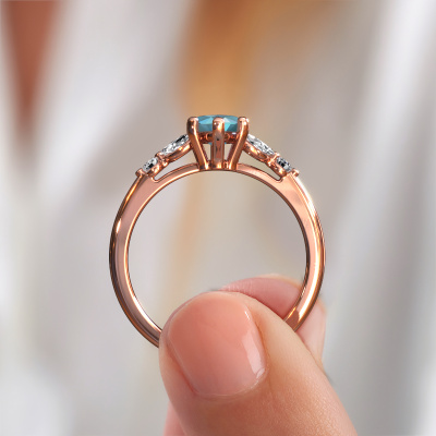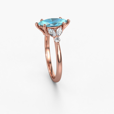 Bovenstaande verlovingsring heeft de naam Megan MRQ. Dit type verlovingsring noemen we een pavé solitaire verlovingsring omdat hij een enkele middensteen heeft waarbij de banden van de verlovingsring ook volgezet zijn. Deze verlovingsring is uitgevoerd in 14 Carat rosé goud en heeft als middensteen een marquise blauw topaas ter grootte van 11x5.5 mm, en in de zijbanden zijn lab-grown diamanten gezet. Ieder juweel wordt met passie en liefde gemaakt door één van onze meestergoudsmeden.. Deze fantasie rosé gouden pavé solitaire verlovingsring heeft een schitterende marquise blauw topaas als center steen, waarbij in de band nog meer lab-grown diamanten zijn gezet om de middensteen nog meer te accentueren. Doordat de zetting van de pootjes om de blauw topaas open is, vangt de blauw topaas het licht van alle kanten op en schittert hierdoor optimaal. Hierboven kun je zien hoe onze goudsmid de verlovingsring heel precies tot in de kleinste details heeft bewerkt, zodat de wat hoger gelegen blauw topaas een echte eyecatcher is. Wat een prachtige verlovingsring om te geven bij je aanzoek aan de liefde van jouw leven, aan jouw stralende middelpunt![bestp1v_long]Heb je zelf een specifieke verlovingsring ergens gezien, die je graag aan jouw geliefde zou willen geven? Bespreek gerust jouw ideeën met onze sieradenontwerpers, want wij zetten graag jouw ontwerp om tot een fantasie verlovingsring. Je kunt tijdens het ontwerpproces steeds meekijken, omdat wij met 3D tekeningen werken. Je krijgt hierdoor al een realistische indruk van hoe jouw ontwerp er in werkelijkheid uit komt te zien. Daarbij kun je een dummy vooraf bestellen. Een dummy is een kunststof ring, die precies dezelfde vormen heeft als jouw uiteindelijke ontwerp. Je kunt deze passen en zien of de breedte en dikte bijvoorbeeld naar wens zijn. Wij sturen je graag een vrijblijvende offerte, waarbij je ongetwijfeld versteld zult staan over de prijs en de kwaliteit van de ring en edelstenen.Om het voor jou makkelijker te maken kun je ieder besteld sieraad binnen 30 dagen na aflevering eenvoudig weer retour sturen.
