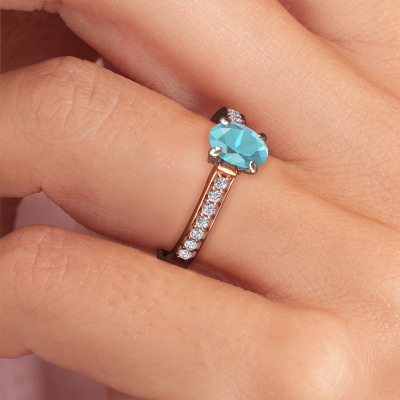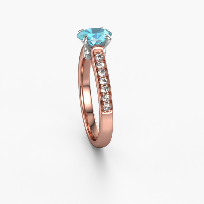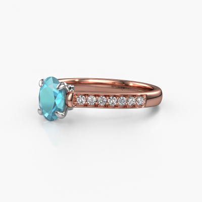 Bovenstaande verlovingsring heeft de naam Valorie ovl 2. Dit type verlovingsring noemen we een pavé solitaire verlovingsring omdat hij een enkele middensteen heeft waarbij de banden van de verlovingsring ook volgezet zijn. Deze verlovingsring is uitgevoerd in 14 Carat rosé goud en heeft als middensteen een ovale blauw topaas ter grootte van 7x5 mm, en in de zijbanden zijn lab-grown diamanten gezet. Ieder juweel wordt met passie en liefde gemaakt door één van onze meestergoudsmeden.. Deze modieuze rosé gouden pavé solitaire verlovingsring heeft een schitterende ovale blauw topaas als center steen, waarbij in de band nog meer lab-grown diamanten zijn gezet om de middensteen nog meer te accentueren. Doordat de zetting van de pootjes om de blauw topaas open is, vangt de blauw topaas het licht van alle kanten op en schittert hierdoor optimaal. Hierboven kun je zien hoe onze goudsmid de verlovingsring heel precies tot in de kleinste details heeft bewerkt, zodat de wat hoger gelegen blauw topaas een echte eyecatcher is. Wat een prachtige verlovingsring om te geven bij je aanzoek aan de liefde van jouw leven, aan jouw stralende middelpunt!Wellicht is het je opgevallen dat onze prijzen gemiddeld 30% lager liggen dan bij een andere juwelier. En dat terwijl de kwaliteit in de meeste gevallen nog beter is! Dit komt doordat onze goudsmeden je verlovingsring direct in ons eigen atelier vervaardigen. Hierdoor hoeven we geen dure voorraden te hanteren en kunnen we ieder gewenst detail direct op jouw verlovingsring aanbrengen.Ons team is iedere dag weer bezig om nieuwe ontwerpen toe te voegen, in samenwerking met onze designers en goudsmeden wordt gekeken hoe we tot het mooiste ontwerp kunnen komen. Wij doen ons best om tot een zo gevarieerd mogelijk aanbod te komen. Wellicht heb je zelf al een mooi idee van een sieraad dat je ooit wel eens gezien hebt. Neem dan eens vrijblijvend contact met ons op. Wij maken een offerte voor je op waarbij wij vrij zeker zijn dat we wat betreft kwaliteit en prijs jou versteld zullen laten staan.Om het voor jou makkelijker te maken kun je ieder besteld sieraad binnen 30 dagen na aflevering eenvoudig weer retour sturen.
