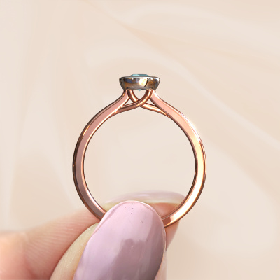 Bovenstaande verlovings ring heeft de naam Kaylee, dit type verlovings ring noemen we een solitaire ring omdat hij een enkele edelsteen bevat. De verlovings ring is uitgevoerd in 14 Carat rosé goud en heeft een ronde blauw topaas ter grootte van 4 mm. Het leuke van onze configurator is dat je zelf je juweel kunt samenstellen tot een eigen persoonlijk juweel. Deze solitaire ring is uitgevoerd in de edelmetaal combinatie rosé goud met witgoud, maar u kunt dus ook uit andere kleuren kiezen. Ieder juweel is gemaakt door een team van gedreven goudsmeden en designers. Hierdoor zal dit unieke pronkstuk een echte eyecatcher zijn.De solitaire verlovings ring is een bijzondere verlovings ring. Juist doordat de chatonzetting open is, creëert de lichtinval een schitterend effect op de edelsteen. Omdat de gekozen edelsteen hoog op de verlovings ring geplaatst wordt, wordt deze modieuze verlovings ring een prachtige eyecatcher. Met veel zorgvuldigheid vervaardigen wij alle details in deze solitaire verlovings ring met de hand, zodat jij binnenkort je aanzoek kunt bekronen met een unieke ring, speciaal voor de liefde van jouw leven!Omdat wij zelf alle verlovings ring maken en direct aan jou leveren kunnen wij je een verlovings ring leveren tegen een prijs die je nergens anders zult tegenkomen. Een ring wordt pas gemaakt als we een bestelling krijgen, hierdoor hebben wij geen dure voorraden en kunnen wij je de beste prijs garanderen. Wij begrijpen dat het kopen van een verlovings ring online spannend is en willen daarom je zoveel mogelijk informeren over alle specifieke eigenschappen van de ring die jij koopt.Ons team ontwerpt dagelijks nieuwe ringen in diverse stijlen. Heb je zelf een solitaire verlovings ring ergens gezien, die jij het liefst aan jouw geliefde zou willen geven? Je kunt altijd jouw ideeën en ontwerp met onze sieradenontwerpers bespreken, want wij zetten graag jouw ontwerp om tot een modieuze verlovings ring. Je kunt tijdens het ontwerpproces steeds meekijken, omdat het ontwerp in een zeer gedetailleerde 3D tekening wordt omgezet. Daarbij kun je een dummy bestellen van het uiteindelijke ontwerp. Een dummy is een kunststof ring, die precies dezelfde vormen heeft als jouw uiteindelijke ontwerp. Je kunt deze passen en zien of de ontworpen verlovings ring helemaal naar jouw wens is. Wij sturen je graag een vrijblijvende offerte, waarbij je ongetwijfeld versteld zult staan over de prijs en de kwaliteit van de ring en edelstenen.Om het voor jou makkelijker te maken kun je ieder besteld sieraad binnen 30 dagen na aflevering eenvoudig weer retour sturen.