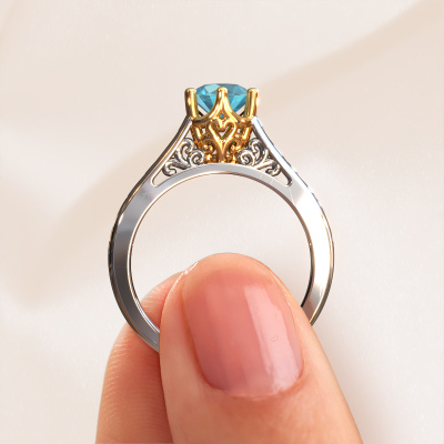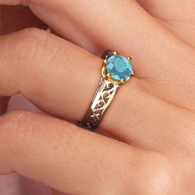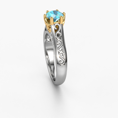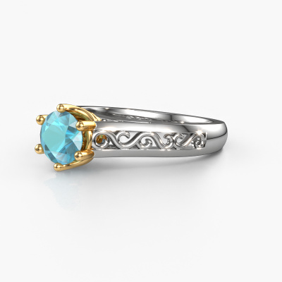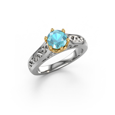 Bovenstaande verlovingsring heeft de naam Shan, dit type verlovingsring noemen we een solitaire ring omdat hij een enkele edelsteen bevat. De verlovingsring is uitgevoerd in 14 Carat witgoud en heeft een ronde blauw topaas ter grootte van 6 mm. Het leuke van onze configurator is dat je zelf je juweel kunt samenstellen tot een eigen persoonlijk juweel. Deze solitaire ring is uitgevoerd in de edelmetaal combinatie witgoud met goud, maar u kunt dus ook uit andere kleuren kiezen. Ieder juweel is gemaakt door een team van gedreven goudsmeden en designers. Hierdoor zal dit unieke pronkstuk een echte eyecatcher zijn.De solitaire verlovingsring is een bijzondere verlovingsring. Juist doordat de chatonzetting open is, creëert de lichtinval een schitterend effect op de edelsteen. Omdat de gekozen edelsteen hoog op de verlovingsring geplaatst wordt, wordt deze Keltische verlovingsring een prachtige eyecatcher. Met veel zorgvuldigheid vervaardigen wij alle details in deze solitaire verlovingsring met de hand, zodat jij binnenkort je aanzoek kunt bekronen met een unieke ring, speciaal voor de liefde van jouw leven!Door onze modernste technieken kunnen wij met uiterste precisie prachtige sieraden te ontwerpen en voor jou personaliseren in de hoogste juwelierskwaliteit. Tegelijkertijd zijn onze verlovingsringen altijd 30% goedkoper dan bij een andere juwelier. Dit komt doordat alle verlovingsringen pas vervaardigd worden op het moment dat deze besteld wordt en we daardoor geen dure voorraden hoeven te hanteren. Mocht je aan een bepaald budget gebonden zijn, kunnen we je graag adviseren welke combinatie je het beste kunt kiezen.Heb je zelf een specifieke verlovingsring ergens gezien, die je graag aan jouw geliefde zou willen geven? Bespreek gerust jouw ideeën met onze sieradenontwerpers, want wij zetten graag jouw ontwerp om tot een Keltische verlovingsring. Je kunt tijdens het ontwerpproces steeds meekijken, omdat wij met 3D tekeningen werken. Je krijgt hierdoor al een realistische indruk van hoe jouw ontwerp er in werkelijkheid uit komt te zien. Daarbij kun je een dummy vooraf bestellen. Een dummy is een kunststof ring, die precies dezelfde vormen heeft als jouw uiteindelijke ontwerp. Je kunt deze passen en zien of de breedte en dikte bijvoorbeeld naar wens zijn. Wij sturen je graag een vrijblijvende offerte, waarbij je ongetwijfeld versteld zult staan over de prijs en de kwaliteit van de ring en edelstenen.Om het voor jou makkelijker te maken kun je ieder besteld sieraad binnen 30 dagen na aflevering eenvoudig weer retour sturen.
