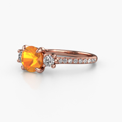 Deze verlovingsring heeft de naam Jesica. Deze verlovingsring uitgevoerd in 14 Carat rosé goud is gezet met 6.8 mm citrien. Wat maakt jullie relatie uniek? Wat is het, dat jij haar wilt gaan vragen om jouw vrouw te worden? Die unieke band die jullie samen hebben, kun je laten weerspiegelen in een unieke ring. Een unieke 3 steens verlovingsring die alleen voor haar vervaardigd is. En daarom past deze klassieke verlovingsring heel mooi bij haar. Ieder detail van deze gracieuze rosé gouden verlovingsring met citrien wordt met de hand samengesteld, bijgewerkt en gepolijst door onze goudsmid in het atelier beneden. Een prachtige verlovingsring is het uiteindelijk resultaat, uniek en perfect gesmeed tot in de kleinste details! Dat is waar onze goudsmeden absoluut voor gaan! Dit juweel is speciaal voor jou gemaakt, met aandacht voor detail en design.Wist je dat we een beste prijs garantie geven voor jouw verlovingsring? Dit is mogelijk omdat al onze sieraden met de hand gemaakt worden in ons eigen atelier. We hebben geen dure voorraden, en we maken pas je verlovingsring op het moment dat je besteld hebt. Doordat we de hele productie zelf in de hand hebben, kunnen wij je goed informeren over alle eigenschappen van deze ring. Juist omdat het kopen van een verlovingsring online spannend is, begrijpen wij dat het fijn is om alle kenmerken te weten van jouw ring.Ons team ontwerpt dagelijks nieuwe ringen in diverse stijlen. Heb je zelf een 3 steens verlovingsring ergens gezien, die jij het liefst aan jouw geliefde zou willen geven? Je kunt altijd jouw ideeën en ontwerp met onze sieradenontwerpers bespreken, want wij zetten graag jouw ontwerp om tot een klassieke verlovingsring. Je kunt tijdens het ontwerpproces steeds meekijken, omdat het ontwerp in een zeer gedetailleerde 3D tekening wordt omgezet. Daarbij kun je een dummy bestellen van het uiteindelijke ontwerp. Een dummy is een kunststof ring, die precies dezelfde vormen heeft als jouw uiteindelijke ontwerp. Je kunt deze passen en zien of de ontworpen verlovingsring helemaal naar jouw wens is. Wij sturen je graag een vrijblijvende offerte, waarbij je ongetwijfeld versteld zult staan over de prijs en de kwaliteit van de ring en edelstenen.Om het voor jou makkelijker te maken kun je ieder besteld sieraad binnen 30 dagen na aflevering eenvoudig weer retour sturen.