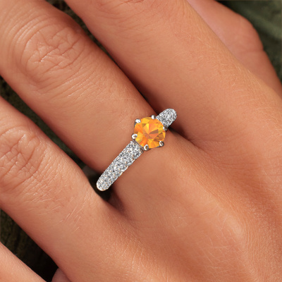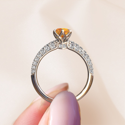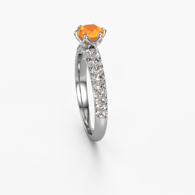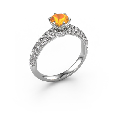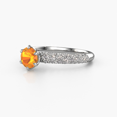 Bovenstaande verlovingsring heeft de naam Meryl. Dit type verlovingsring noemen we een pavé solitaire verlovingsring omdat hij een enkele middensteen heeft waarbij de banden van de verlovingsring ook volgezet zijn. Deze verlovingsring is uitgevoerd in 14 Carat witgoud en heeft als middensteen een ronde citrien ter grootte van 5.7 mm, en in de zijbanden zijn diamanten gezet. Ieder juweel is speciaal voor jou gemaakt, met aandacht voor detail en design.. Deze exclusieve witgouden pavé solitaire verlovingsring heeft een schitterende ronde citrien als center steen, waarbij in de band nog meer diamanten zijn gezet om de middensteen nog meer te accentueren. Doordat de zetting van de pootjes om de citrien open is, vangt de citrien het licht van alle kanten op en schittert hierdoor optimaal. Hierboven kun je zien hoe onze goudsmid de verlovingsring heel precies tot in de kleinste details heeft bewerkt, zodat de wat hoger gelegen citrien een echte eyecatcher is. Wat een prachtige verlovingsring om te geven bij je aanzoek aan de liefde van jouw leven, aan jouw stralende middelpunt!Wist je dat we een beste prijs garantie geven voor jouw verlovingsring? Dit is mogelijk omdat al onze sieraden met de hand gemaakt worden in ons eigen atelier. We hebben geen dure voorraden, en we maken pas je verlovingsring op het moment dat je besteld hebt. Doordat we de hele productie zelf in de hand hebben, kunnen wij je goed informeren over alle eigenschappen van deze ring. Juist omdat het kopen van een verlovingsring online spannend is, begrijpen wij dat het fijn is om alle kenmerken te weten van jouw ring.Heb je zelf een specifieke verlovingsring ergens gezien, die je graag aan jouw geliefde zou willen geven? Bespreek gerust jouw ideeën met onze sieradenontwerpers, want wij zetten graag jouw ontwerp om tot een exclusieve verlovingsring. Je kunt tijdens het ontwerpproces steeds meekijken, omdat wij met 3D tekeningen werken. Je krijgt hierdoor al een realistische indruk van hoe jouw ontwerp er in werkelijkheid uit komt te zien. Daarbij kun je een dummy vooraf bestellen. Een dummy is een kunststof ring, die precies dezelfde vormen heeft als jouw uiteindelijke ontwerp. Je kunt deze passen en zien of de breedte en dikte bijvoorbeeld naar wens zijn. Wij sturen je graag een vrijblijvende offerte, waarbij je ongetwijfeld versteld zult staan over de prijs en de kwaliteit van de ring en edelstenen.Om het voor jou makkelijker te maken kun je ieder besteld sieraad binnen 30 dagen na aflevering eenvoudig weer retour sturen.