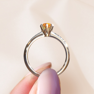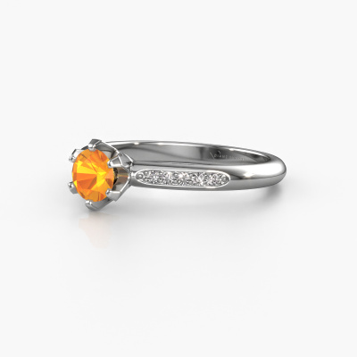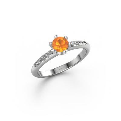 Bovenstaande verlovingsring heeft de naam Tiffy 2. Dit type verlovingsring noemen we een pavé solitaire verlovingsring omdat hij een enkele middensteen heeft waarbij de banden van de verlovingsring ook volgezet zijn. Deze verlovingsring is uitgevoerd in 14 Carat witgoud en heeft als middensteen een ronde citrien ter grootte van 4.7 mm, en in de zijbanden zijn diamanten gezet. Ieder juweel is gemaakt om aan je vinger te stralen, ieder sieraad wordt met liefde door onze goudsmeden met de hand gemaakt.. Deze traditionele witgouden pavé solitaire verlovingsring heeft een schitterende ronde citrien als center steen, waarbij in de band nog meer diamanten zijn gezet om de middensteen nog meer te accentueren. Doordat de zetting van de pootjes om de citrien open is, vangt de citrien het licht van alle kanten op en schittert hierdoor optimaal. Hierboven kun je zien hoe onze goudsmid de verlovingsring heel precies tot in de kleinste details heeft bewerkt, zodat de wat hoger gelegen citrien een echte eyecatcher is. Wat een prachtige verlovingsring om te geven bij je aanzoek aan de liefde van jouw leven, aan jouw stralende middelpunt!Door onze modernste technieken kunnen wij met uiterste precisie prachtige sieraden te ontwerpen en voor jou personaliseren in de hoogste juwelierskwaliteit. Tegelijkertijd zijn onze verlovingsringen altijd 30% goedkoper dan bij een andere juwelier. Dit komt doordat alle verlovingsringen pas vervaardigd worden op het moment dat deze besteld wordt en we daardoor geen dure voorraden hoeven te hanteren. Mocht je aan een bepaald budget gebonden zijn, kunnen we je graag adviseren welke combinatie je het beste kunt kiezen.Iedere dag is ons team van goudsmeden en sieradenontwerpers aan het werk om nieuwe sieraden te creëren. Het kan zijn dat je ergens een traditionele verlovingsring gezien hebt, die je als basis wilt nemen bij het ontwerpen van jouw unieke ring. Neem gerust contact met ons op en we zullen je een aanbod doen, waar je vrijwel zeker verwonderd zult zijn over de kwaliteit en de prijs.Om het voor jou makkelijker te maken kun je ieder besteld sieraad binnen 30 dagen na aflevering eenvoudig weer retour sturen.