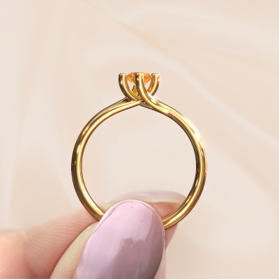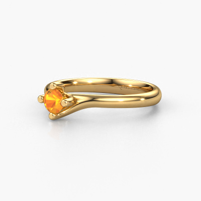 Voor jou is er maar één! Zij is zeldzaam, uniek en puur... Deze bijzondere moderne gouden solitaire ring met citrien onderstreept deze karaktereigenschappen heel prachtig. Deze citrien is zorgvuldig geselecteerd door onze goudsmeden, en is net als je geliefde uniek. Wat is mooier om haar dit symbool te schenken bij jouw aanzoek? Bovenstaande verlovingsring heeft de naam Dewi Round, dit type verlovingsring noemen we een solitaire ring omdat hij een enkele edelsteen bevat. De verlovingsring is uitgevoerd in 14 Carat goud en heeft een ronde citrien ter grootte van 4 mm. Ieder juweel is gemaakt om aan jouw vinger te stralen, ieder sieraad wordt met liefde door onze goudsmeden met de hand gemaakt.Wist je dat we een beste prijs garantie geven voor jouw verlovingsring? Dit is mogelijk omdat al onze sieraden met de hand gemaakt worden in ons eigen atelier. We hebben geen dure voorraden, en we maken pas je verlovingsring op het moment dat je besteld hebt. Doordat we de hele productie zelf in de hand hebben, kunnen wij je goed informeren over alle eigenschappen van deze ring. Juist omdat het kopen van een verlovingsring online spannend is, begrijpen wij dat het fijn is om alle kenmerken te weten van jouw ring.Ons team ontwerpt dagelijks nieuwe ringen in diverse stijlen. Heb je zelf een solitaire verlovingsring ergens gezien, die jij het liefst aan jouw geliefde zou willen geven? Je kunt altijd jouw ideeën en ontwerp met onze sieradenontwerpers bespreken, want wij zetten graag jouw ontwerp om tot een moderne verlovingsring. Je kunt tijdens het ontwerpproces steeds meekijken, omdat het ontwerp in een zeer gedetailleerde 3D tekening wordt omgezet. Daarbij kun je een dummy bestellen van het uiteindelijke ontwerp. Een dummy is een kunststof ring, die precies dezelfde vormen heeft als jouw uiteindelijke ontwerp. Je kunt deze passen en zien of de ontworpen verlovingsring helemaal naar jouw wens is. Wij sturen je graag een vrijblijvende offerte, waarbij je ongetwijfeld versteld zult staan over de prijs en de kwaliteit van de ring en edelstenen.Om het voor jou makkelijker te maken kun je ieder besteld sieraad binnen 30 dagen na aflevering eenvoudig weer retour sturen.