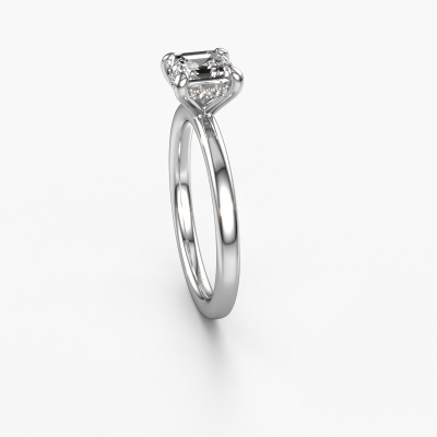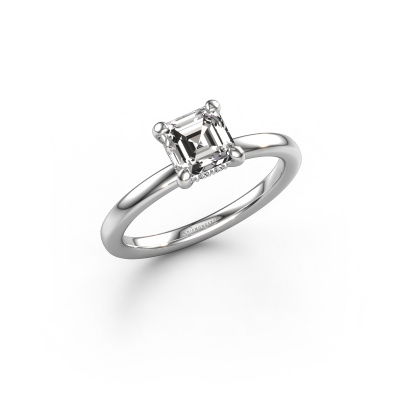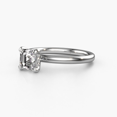 Bovenstaande verlovingsring heeft de naam Simone ASC 2. Dit type verlovingsring noemen we een pavé solitaire verlovingsring omdat hij een enkele middensteen heeft waarbij de banden van de verlovingsring ook volgezet zijn. Deze verlovingsring is uitgevoerd in 14 Carat witgoud en heeft als middensteen een asscher custom diamant ter grootte van 5.5 mm, en in de zijbanden zijn lab-grown diamanten gezet. Ieder juweel is uniek, doordat je deze ring geheel naar eigen wensen kunt samenstellen.. Deze exclusieve witgouden pavé solitaire verlovingsring heeft een schitterende asscher custom diamant als center steen, waarbij in de band nog meer lab-grown diamanten zijn gezet om de middensteen nog meer te accentueren. Doordat de zetting van de pootjes om de custom diamant open is, vangt de custom diamant het licht van alle kanten op en schittert hierdoor optimaal. Hierboven kun je zien hoe onze goudsmid de verlovingsring heel precies tot in de kleinste details heeft bewerkt, zodat de wat hoger gelegen custom diamant een echte eyecatcher is. Wat een prachtige verlovingsring om te geven bij je aanzoek aan de liefde van jouw leven, aan jouw stralende middelpunt!Omdat wij zelf alle verlovingsring maken en direct aan jou leveren kunnen wij je een verlovingsring leveren tegen een prijs die je nergens anders zult tegenkomen. Een ring wordt pas gemaakt als we een bestelling krijgen, hierdoor hebben wij geen dure voorraden en kunnen wij je de beste prijs garanderen. Wij begrijpen dat het kopen van een verlovingsring online spannend is en willen daarom je zoveel mogelijk informeren over alle specifieke eigenschappen van de ring die jij koopt.Heb je zelf een speciale ring in gedachten, die je wellicht ergens gezien hebt? Je kunt je ideeën altijd met ons bespreken, wij zetten graag jouw ontwerp om tot een unieke verlovingsring. Het ontwerp kun je volgen, omdat wij met 3D tekeningen werken. Hierdoor krijg je al een realistische indruk van hoe jouw ontwerp er in het echt uit komt te zien. Wij sturen je graag een vrijblijvende offerte, waarbij je ongetwijfeld verwonderd zult zijn over de prijs in combinatie met de uitstekende kwaliteit die we aanbieden.Om het voor jou makkelijker te maken kun je ieder besteld sieraad binnen 30 dagen na aflevering eenvoudig weer retour sturen.