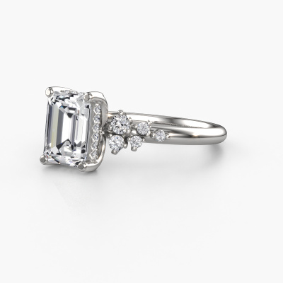 Bovenstaande verlovingsring heeft de naam Emma EME. Dit type verlovingsring noemen we een pavé solitaire verlovingsring omdat hij een enkele middensteen heeft waarbij de banden van de verlovingsring ook volgezet zijn. Deze verlovingsring is uitgevoerd in 14 Carat witgoud en heeft als middensteen een smaragd geslepen custom diamant ter grootte van 8x6 mm, en in de zijbanden zijn lab-grown diamanten gezet. Ieder juweel wordt met passie en liefde gemaakt door één van onze meestergoudsmeden.. Deze fantasie witgouden pavé solitaire verlovingsring heeft een schitterende smaragd geslepen custom diamant als center steen, waarbij in de band nog meer lab-grown diamanten zijn gezet om de middensteen nog meer te accentueren. Doordat de zetting van de pootjes om de custom diamant open is, vangt de custom diamant het licht van alle kanten op en schittert hierdoor optimaal. Hierboven kun je zien hoe onze goudsmid de verlovingsring heel precies tot in de kleinste details heeft bewerkt, zodat de wat hoger gelegen custom diamant een echte eyecatcher is. Wat een prachtige verlovingsring om te geven bij je aanzoek aan de liefde van jouw leven, aan jouw stralende middelpunt!Wist je dat we een beste prijs garantie geven voor jouw verlovingsring? Dit is mogelijk omdat al onze sieraden met de hand gemaakt worden in ons eigen atelier. We hebben geen dure voorraden, en we maken pas je verlovingsring op het moment dat je besteld hebt. Doordat we de hele productie zelf in de hand hebben, kunnen wij je goed informeren over alle eigenschappen van deze ring. Juist omdat het kopen van een verlovingsring online spannend is, begrijpen wij dat het fijn is om alle kenmerken te weten van jouw ring.Ons team is iedere dag weer bezig om nieuwe ontwerpen toe te voegen, in samenwerking met onze designers en goudsmeden wordt gekeken hoe we tot het mooiste ontwerp kunnen komen. Wij doen ons best om tot een zo gevarieerd mogelijk aanbod te komen. Wellicht heb je zelf al een mooi idee van een sieraad dat je ooit wel eens gezien hebt. Neem dan eens vrijblijvend contact met ons op. Wij maken een offerte voor je op waarbij wij vrij zeker zijn dat we wat betreft kwaliteit en prijs jou versteld zullen laten staan.Om het voor jou makkelijker te maken kun je ieder besteld sieraad binnen 30 dagen na aflevering eenvoudig weer retour sturen.