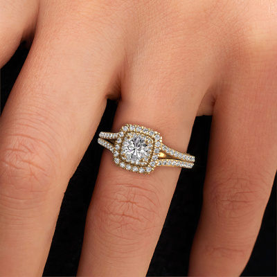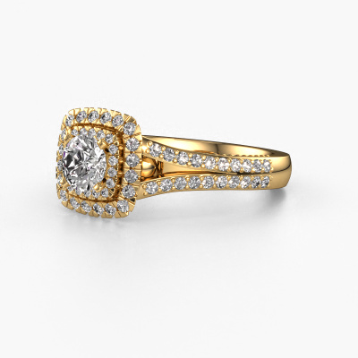 Bovenstaande verlovingsring heeft de naam Annette. Dit type verlovingsring noemen we een halo verlovingsring omdat hij een enkele middensteen heeft waarbij de banden van de verlovingsring ook volgezet zijn. De verlovingsring is uitgevoerd in de combinatie 14 Carat goud met goud en heeft als middensteen een ronde diamant ter grootte van 0.50 crt en in de zijbanden zijn diamanten gezet. Ieder juweel wordt speciaal voor jou gemaakt door onze meester goudsmeden in ons eigen atelier.Deze vintage gouden halo verlovingsring heeft een schitterende ronde diamant als centersteen, waarbij in de band nog meer diamanten zijn gezet om de middensteen nog meer te accentueren. Doordat de zetting van de pootjes om de diamant open is, vangt de diamant het licht van alle kanten op en schittert hierdoor optimaal. Hierboven kun je zien hoe onze goudsmid de verlovingsring heel precies tot in de kleinste details heeft bewerkt, zodat de wat hoger gelegen diamant een echte eyecatcher is. Wat een prachtige verlovingsring om te geven bij je aanzoek aan de liefde van jouw leven, aan jouw stralende middelpunt!Wist je dat we een beste prijs garantie geven voor jouw verlovingsring? Dit is mogelijk omdat al onze sieraden met de hand gemaakt worden in ons eigen atelier. We hebben geen dure voorraden, en we maken pas je verlovingsring op het moment dat je besteld hebt. Doordat we de hele productie zelf in de hand hebben, kunnen wij je goed informeren over alle eigenschappen van deze ring. Juist omdat het kopen van een verlovingsring online spannend is, begrijpen wij dat het fijn is om alle kenmerken te weten van jouw ring.Heb je zelf een specifieke verlovingsring ergens gezien, die je graag aan jouw geliefde zou willen geven? Bespreek gerust jouw ideeën met onze sieradenontwerpers, want wij zetten graag jouw ontwerp om tot een vintage verlovingsring. Je kunt tijdens het ontwerpproces steeds meekijken, omdat wij met 3D tekeningen werken. Je krijgt hierdoor al een realistische indruk van hoe jouw ontwerp er in werkelijkheid uit komt te zien. Daarbij kun je een dummy vooraf bestellen. Een dummy is een kunststof ring, die precies dezelfde vormen heeft als jouw uiteindelijke ontwerp. Je kunt deze passen en zien of de breedte en dikte bijvoorbeeld naar wens zijn. Wij sturen je graag een vrijblijvende offerte, waarbij je ongetwijfeld versteld zult staan over de prijs en de kwaliteit van de ring en edelstenen.Om het voor jou makkelijker te maken kun je ieder besteld sieraad binnen 30 dagen na aflevering eenvoudig weer retour sturen.