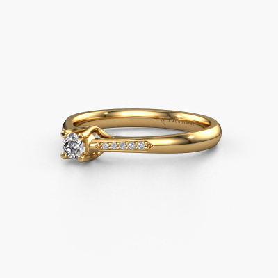 Bovenstaande promise ring heeft de naam Janna 2. Dit type promise ring noemen we een pavé solitaire promise ring omdat hij een enkele middensteen heeft waarbij de banden van de promise ring ook volgezet zijn. Deze promise ring is uitgevoerd in 14 Carat goud en heeft als middensteen een ronde diamant ter grootte van 0.10 crt, en in de zijbanden zijn diamanten gezet. Ieder juweel wordt speciaal voor jou gemaakt door onze meester goudsmeden in ons eigen atelier.. Deze klassieke gouden pavé solitaire promise ring heeft een schitterende ronde diamant als center steen, waarbij in de band nog meer diamanten zijn gezet om de middensteen nog meer te accentueren. Doordat de zetting van de pootjes om de diamant open is, vangt de diamant het licht van alle kanten op en schittert hierdoor optimaal. Hierboven kun je zien hoe onze goudsmid de promise ring heel precies tot in de kleinste details heeft bewerkt, zodat de wat hoger gelegen diamant een echte eyecatcher is. Wat een prachtige promise ring om te geven bij je aanzoek aan de liefde van jouw leven, aan jouw stralende middelpunt!Door het gebruik van de modernste technieken, gecombineerd met ambachtelijk vakmanschap kunnen wij alle promise ringen zelf in ons atelier maken. Ieder sieraad wordt pas gemaakt nadat deze besteld is. Dit heeft als bijkomend voordeel dat we kunnen leveren tegen een prijs die je nergens anders tegenkomt.Heb je zelf een speciale ring in gedachten, die je wellicht ergens gezien hebt? Je kunt je ideeën altijd met ons bespreken, wij zetten graag jouw ontwerp om tot een unieke promise ring. Het ontwerp kun je volgen, omdat wij met 3D tekeningen werken. Hierdoor krijg je al een realistische indruk van hoe jouw ontwerp er in het echt uit komt te zien. Wij sturen je graag een vrijblijvende offerte, waarbij je ongetwijfeld verwonderd zult zijn over de prijs in combinatie met de uitstekende kwaliteit die we aanbieden.Om het voor jou makkelijker te maken kun je ieder besteld sieraad binnen 30 dagen na aflevering eenvoudig weer retour sturen.