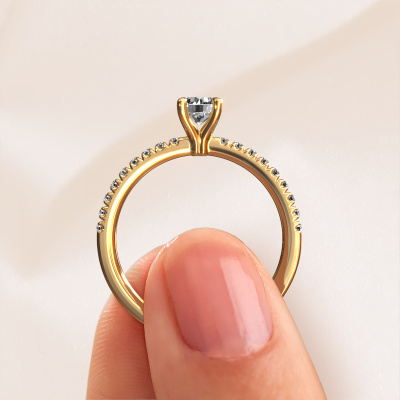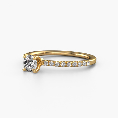 Bovenstaande verlovingsring heeft de naam Crystal RND 2. Dit type verlovingsring noemen we een pavé solitaire verlovingsring omdat hij een enkele middensteen heeft waarbij de banden van de verlovingsring ook volgezet zijn. De verlovingsring is uitgevoerd in de combinatie 14 Carat goud met goud en heeft als middensteen een ronde diamant ter grootte van 0.40 crt en in de zijbanden zijn lab-grown diamanten gezet. Ieder juweel is uniek, doordat je deze ring geheel naar eigen wensen kunt samenstellen.Deze klassieke gouden pavé solitaire verlovingsring heeft een schitterende ronde diamant als centersteen, waarbij in de band nog meer diamanten zijn gezet om de middensteen nog meer te accentueren. Doordat de zetting van de pootjes om de diamant open is, vangt de diamant het licht van alle kanten op en schittert hierdoor optimaal. Hierboven kun je zien hoe onze goudsmid de verlovingsring heel precies tot in de kleinste details heeft bewerkt, zodat de wat hoger gelegen diamant een echte eyecatcher is. Wat een prachtige verlovingsring om te geven bij je aanzoek aan de liefde van jouw leven, aan jouw stralende middelpunt!Onze goudsmeden vervaardigen pas je Crystal RND 2 verlovingsring, zodra je deze besteld hebt. We hebben geen voorraden. Het voordeel hiervan is dat we de voorraad niet door hoeven te berekenen in de prijs, en kunnen daardoor sieraden leveren tegen een bijzonder lage prijs.Ons team ontwerpt dagelijks nieuwe ringen in diverse stijlen. Heb je zelf een pavé solitaire verlovingsring ergens gezien, die jij het liefst aan jouw geliefde zou willen geven? Je kunt altijd jouw ideeën en ontwerp met onze sieradenontwerpers bespreken, want wij zetten graag jouw ontwerp om tot een klassieke verlovingsring. Je kunt tijdens het ontwerpproces steeds meekijken, omdat het ontwerp in een zeer gedetailleerde 3D tekening wordt omgezet. Daarbij kun je een dummy bestellen van het uiteindelijke ontwerp. Een dummy is een kunststof ring, die precies dezelfde vormen heeft als jouw uiteindelijke ontwerp. Je kunt deze passen en zien of de ontworpen verlovingsring helemaal naar jouw wens is. Wij sturen je graag een vrijblijvende offerte, waarbij je ongetwijfeld versteld zult staan over de prijs en de kwaliteit van de ring en edelstenen.Om het voor jou makkelijker te maken kun je ieder besteld sieraad binnen 30 dagen na aflevering eenvoudig weer retour sturen.