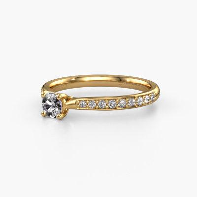 Bovenstaande verlovingsring heeft de naam Mignon rnd 2. Dit type verlovingsring noemen we een pavé solitaire verlovingsring omdat hij een enkele middensteen heeft waarbij de banden van de verlovingsring ook volgezet zijn. De verlovingsring is uitgevoerd in de combinatie 14 Carat goud met goud en heeft als middensteen een ronde diamant ter grootte van 0.30 crt en in de zijbanden zijn lab-grown diamanten gezet. Ieder juweel is gemaakt door een team van gedreven goudsmeden en designers. Hierdoor zal dit unieke pronkstuk een echte eyecatcher zijn.Deze luxe gouden pavé solitaire verlovingsring heeft een schitterende ronde diamant als centersteen, waarbij in de band nog meer diamanten zijn gezet om de middensteen nog meer te accentueren. Doordat de zetting van de pootjes om de diamant open is, vangt de diamant het licht van alle kanten op en schittert hierdoor optimaal. Hierboven kun je zien hoe onze goudsmid de verlovingsring heel precies tot in de kleinste details heeft bewerkt, zodat de wat hoger gelegen diamant een echte eyecatcher is. Wat een prachtige verlovingsring om te geven bij je aanzoek aan de liefde van jouw leven, aan jouw stralende middelpunt!Door onze modernste technieken kunnen wij met uiterste precisie prachtige sieraden te ontwerpen en voor jou personaliseren in de hoogste juwelierskwaliteit. Tegelijkertijd zijn onze verlovingsringen altijd 30% goedkoper dan bij een andere juwelier. Dit komt doordat alle verlovingsringen pas vervaardigd worden op het moment dat deze besteld wordt en we daardoor geen dure voorraden hoeven te hanteren. Mocht je aan een bepaald budget gebonden zijn, kunnen we je graag adviseren welke combinatie je het beste kunt kiezen.Ons team ontwerpt dagelijks nieuwe ringen in diverse stijlen. Heb je zelf een pavé solitaire verlovingsring ergens gezien, die jij het liefst aan jouw geliefde zou willen geven? Je kunt altijd jouw ideeën en ontwerp met onze sieradenontwerpers bespreken, want wij zetten graag jouw ontwerp om tot een luxe verlovingsring. Je kunt tijdens het ontwerpproces steeds meekijken, omdat het ontwerp in een zeer gedetailleerde 3D tekening wordt omgezet. Daarbij kun je een dummy bestellen van het uiteindelijke ontwerp. Een dummy is een kunststof ring, die precies dezelfde vormen heeft als jouw uiteindelijke ontwerp. Je kunt deze passen en zien of de ontworpen verlovingsring helemaal naar jouw wens is. Wij sturen je graag een vrijblijvende offerte, waarbij je ongetwijfeld versteld zult staan over de prijs en de kwaliteit van de ring en edelstenen.Om het voor jou makkelijker te maken kun je ieder besteld sieraad binnen 30 dagen na aflevering eenvoudig weer retour sturen.