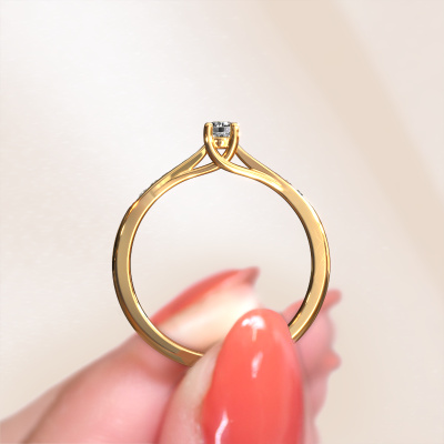 Bovenstaande verlovingsring heeft de naam Mia 2. Dit type verlovingsring noemen we een pavé solitaire verlovingsring omdat hij een enkele middensteen heeft waarbij de banden van de verlovingsring ook volgezet zijn. Deze verlovingsring is uitgevoerd in 14 Carat goud en heeft als middensteen een ronde diamant ter grootte van 0.08 crt, en in de zijbanden zijn lab-grown diamanten gezet. Ieder juweel is speciaal voor jou gemaakt, met aandacht voor detail en design.. Deze moderne gouden pavé solitaire verlovingsring heeft een schitterende ronde diamant als center steen, waarbij in de band nog meer lab-grown diamanten zijn gezet om de middensteen nog meer te accentueren. Doordat de zetting van de pootjes om de diamant open is, vangt de diamant het licht van alle kanten op en schittert hierdoor optimaal. Hierboven kun je zien hoe onze goudsmid de verlovingsring heel precies tot in de kleinste details heeft bewerkt, zodat de wat hoger gelegen diamant een echte eyecatcher is. Wat een prachtige verlovingsring om te geven bij je aanzoek aan de liefde van jouw leven, aan jouw stralende middelpunt!Door onze modernste technieken kunnen wij met uiterste precisie prachtige sieraden te ontwerpen en voor jou personaliseren in de hoogste juwelierskwaliteit. Tegelijkertijd zijn onze verlovingsringen altijd 30% goedkoper dan bij een andere juwelier. Dit komt doordat alle verlovingsringen pas vervaardigd worden op het moment dat deze besteld wordt en we daardoor geen dure voorraden hoeven te hanteren. Mocht je aan een bepaald budget gebonden zijn, kunnen we je graag adviseren welke combinatie je het beste kunt kiezen.Ons team ontwerpt dagelijks nieuwe ringen in diverse stijlen. Heb je zelf een pavé solitaire verlovingsring ergens gezien, die jij het liefst aan jouw geliefde zou willen geven? Je kunt altijd jouw ideeën en ontwerp met onze sieradenontwerpers bespreken, want wij zetten graag jouw ontwerp om tot een moderne verlovingsring. Je kunt tijdens het ontwerpproces steeds meekijken, omdat het ontwerp in een zeer gedetailleerde 3D tekening wordt omgezet. Daarbij kun je een dummy bestellen van het uiteindelijke ontwerp. Een dummy is een kunststof ring, die precies dezelfde vormen heeft als jouw uiteindelijke ontwerp. Je kunt deze passen en zien of de ontworpen verlovingsring helemaal naar jouw wens is. Wij sturen je graag een vrijblijvende offerte, waarbij je ongetwijfeld versteld zult staan over de prijs en de kwaliteit van de ring en edelstenen.Om het voor jou makkelijker te maken kun je ieder besteld sieraad binnen 30 dagen na aflevering eenvoudig weer retour sturen.