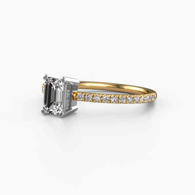 Bovenstaande verlovingsring heeft de naam Denita 2 EME. Dit type verlovingsring noemen we een pavé solitaire verlovingsring omdat hij een enkele middensteen heeft waarbij de banden van de verlovingsring ook volgezet zijn. Deze verlovingsring is uitgevoerd in 14 Carat goud en heeft als middensteen een smaragd geslepen diamant ter grootte van 0.70 crt, en in de zijbanden zijn diamanten gezet. Ieder juweel wordt speciaal voor jou gemaakt door onze meester goudsmeden in ons eigen atelier.. Deze traditionele gouden pavé solitaire verlovingsring heeft een schitterende smaragd geslepen diamant als center steen, waarbij in de band nog meer diamanten zijn gezet om de middensteen nog meer te accentueren. Doordat de zetting van de pootjes om de diamant open is, vangt de diamant het licht van alle kanten op en schittert hierdoor optimaal. Hierboven kun je zien hoe onze goudsmid de verlovingsring heel precies tot in de kleinste details heeft bewerkt, zodat de wat hoger gelegen diamant een echte eyecatcher is. Wat een prachtige verlovingsring om te geven bij je aanzoek aan de liefde van jouw leven, aan jouw stralende middelpunt!Wellicht is het je opgevallen dat onze prijzen gemiddeld 30% lager liggen dan bij een andere juwelier. En dat terwijl de kwaliteit in de meeste gevallen nog beter is! Dit komt doordat onze goudsmeden je verlovingsring direct in ons eigen atelier vervaardigen. Hierdoor hoeven we geen dure voorraden te hanteren en kunnen we ieder gewenst detail direct op jouw verlovingsring aanbrengen.Ons team is iedere dag weer bezig om nieuwe ontwerpen toe te voegen, in samenwerking met onze designers en goudsmeden wordt gekeken hoe we tot het mooiste ontwerp kunnen komen. Wij doen ons best om tot een zo gevarieerd mogelijk aanbod te komen. Wellicht heb je zelf al een mooi idee van een sieraad dat je ooit wel eens gezien hebt. Neem dan eens vrijblijvend contact met ons op. Wij maken een offerte voor je op waarbij wij vrij zeker zijn dat we wat betreft kwaliteit en prijs jou versteld zullen laten staan.Om het voor jou makkelijker te maken kun je ieder besteld sieraad binnen 30 dagen na aflevering eenvoudig weer retour sturen.
