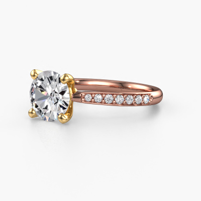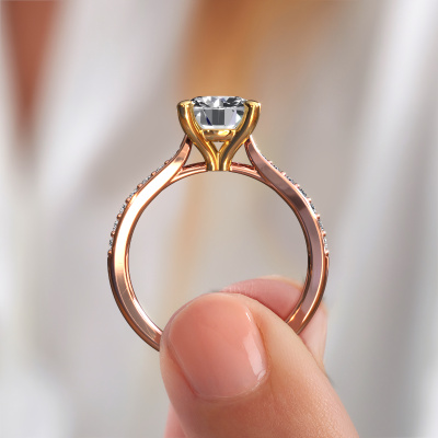 Bovenstaande verlovingsring heeft de naam Mignon RND 2. Dit type verlovingsring noemen we een pavé solitaire verlovingsring omdat hij een enkele middensteen heeft waarbij de banden van de verlovingsring ook volgezet zijn. De verlovingsring is uitgevoerd in de combinatie 14 Carat rosé goud met goud en heeft als middensteen een ronde diamant ter grootte van 2.00 crt en in de zijbanden zijn lab-grown diamanten gezet. Ieder juweel is gemaakt door een team van gedreven goudsmeden en designers. Hierdoor zal dit unieke pronkstuk een echte eyecatcher zijn.Deze luxe rosé gouden pavé solitaire verlovingsring heeft een schitterende ronde diamant als centersteen, waarbij in de band nog meer diamanten zijn gezet om de middensteen nog meer te accentueren. Doordat de zetting van de pootjes om de diamant open is, vangt de diamant het licht van alle kanten op en schittert hierdoor optimaal. Hierboven kun je zien hoe onze goudsmid de verlovingsring heel precies tot in de kleinste details heeft bewerkt, zodat de wat hoger gelegen diamant een echte eyecatcher is. Wat een prachtige verlovingsring om te geven bij je aanzoek aan de liefde van jouw leven, aan jouw stralende middelpunt!Door onze modernste technieken kunnen wij met uiterste precisie prachtige sieraden te ontwerpen en voor jou personaliseren in de hoogste juwelierskwaliteit. Tegelijkertijd zijn onze verlovingsringen altijd 30% goedkoper dan bij een andere juwelier. Dit komt doordat alle verlovingsringen pas vervaardigd worden op het moment dat deze besteld wordt en we daardoor geen dure voorraden hoeven te hanteren. Mocht je aan een bepaald budget gebonden zijn, kunnen we je graag adviseren welke combinatie je het beste kunt kiezen.Ons team ontwerpt dagelijks nieuwe ringen in diverse stijlen. Heb je zelf een pavé solitaire verlovingsring ergens gezien, die jij het liefst aan jouw geliefde zou willen geven? Je kunt altijd jouw ideeën en ontwerp met onze sieradenontwerpers bespreken, want wij zetten graag jouw ontwerp om tot een luxe verlovingsring. Je kunt tijdens het ontwerpproces steeds meekijken, omdat het ontwerp in een zeer gedetailleerde 3D tekening wordt omgezet. Daarbij kun je een dummy bestellen van het uiteindelijke ontwerp. Een dummy is een kunststof ring, die precies dezelfde vormen heeft als jouw uiteindelijke ontwerp. Je kunt deze passen en zien of de ontworpen verlovingsring helemaal naar jouw wens is. Wij sturen je graag een vrijblijvende offerte, waarbij je ongetwijfeld versteld zult staan over de prijs en de kwaliteit van de ring en edelstenen.Om het voor jou makkelijker te maken kun je ieder besteld sieraad binnen 30 dagen na aflevering eenvoudig weer retour sturen.