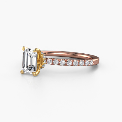Bovenstaande verlovingsring heeft de naam Crystal EME 4. Dit type verlovingsring noemen we een pavé solitaire verlovingsring omdat hij een enkele middensteen heeft waarbij de banden van de verlovingsring ook volgezet zijn. De verlovingsring is uitgevoerd in de combinatie 14 Carat rosé goud met rosé goud en heeft als middensteen een smaragd geslepen diamant ter grootte van 0.90 crt en in de zijbanden zijn lab-grown diamanten gezet. Ieder juweel is gemaakt om aan je vinger te stralen, ieder sieraad wordt met liefde door onze goudsmeden met de hand gemaakt.Deze modieuze rosé gouden pavé solitaire verlovingsring heeft een schitterende smaragd geslepen diamant als centersteen, waarbij in de band nog meer diamanten zijn gezet om de middensteen nog meer te accentueren. Doordat de zetting van de pootjes om de diamant open is, vangt de diamant het licht van alle kanten op en schittert hierdoor optimaal. Hierboven kun je zien hoe onze goudsmid de verlovingsring heel precies tot in de kleinste details heeft bewerkt, zodat de wat hoger gelegen diamant een echte eyecatcher is. Wat een prachtige verlovingsring om te geven bij je aanzoek aan de liefde van jouw leven, aan jouw stralende middelpunt!Wist je dat we een beste prijs garantie geven voor jouw verlovingsring? Dit is mogelijk omdat al onze sieraden met de hand gemaakt worden in ons eigen atelier. We hebben geen dure voorraden, en we maken pas je verlovingsring op het moment dat je besteld hebt. Doordat we de hele productie zelf in de hand hebben, kunnen wij je goed informeren over alle eigenschappen van deze ring. Juist omdat het kopen van een verlovingsring online spannend is, begrijpen wij dat het fijn is om alle kenmerken te weten van jouw ring.Ons team is iedere dag weer bezig om nieuwe ontwerpen toe te voegen, in samenwerking met onze designers en goudsmeden wordt gekeken hoe we tot het mooiste ontwerp kunnen komen. Wij doen ons best om tot een zo gevarieerd mogelijk aanbod te komen. Wellicht heb je zelf al een mooi idee van een sieraad dat je ooit wel eens gezien hebt. Neem dan eens vrijblijvend contact met ons op. Wij maken een offerte voor je op waarbij wij vrij zeker zijn dat we wat betreft kwaliteit en prijs jou versteld zullen laten staan.Om het voor jou makkelijker te maken kun je ieder besteld sieraad binnen 30 dagen na aflevering eenvoudig weer retour sturen.