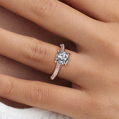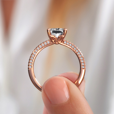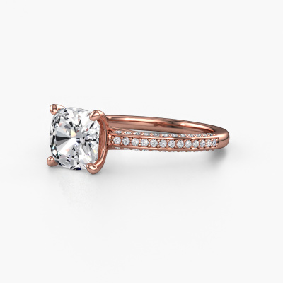 Bovenstaande verlovingsring heeft de naam Elenore cus. Dit type verlovingsring noemen we een pavé solitaire verlovingsring omdat hij een enkele middensteen heeft waarbij de banden van de verlovingsring ook volgezet zijn. Deze verlovingsring is uitgevoerd in 14 Carat rosé goud en heeft als middensteen een cushion diamant ter grootte van 2.00 crt, en in de zijbanden zijn lab-grown diamanten gezet. Ieder juweel is gemaakt door een team van gedreven goudsmeden en designers. Hierdoor zal dit unieke pronkstuk een echte eyecatcher zijn.. Deze eigentijdse rosé gouden pavé solitaire verlovingsring heeft een schitterende cushion diamant als center steen, waarbij in de band nog meer lab-grown diamanten zijn gezet om de middensteen nog meer te accentueren. Doordat de zetting van de pootjes om de diamant open is, vangt de diamant het licht van alle kanten op en schittert hierdoor optimaal. Hierboven kun je zien hoe onze goudsmid de verlovingsring heel precies tot in de kleinste details heeft bewerkt, zodat de wat hoger gelegen diamant een echte eyecatcher is. Wat een prachtige verlovingsring om te geven bij je aanzoek aan de liefde van jouw leven, aan jouw stralende middelpunt!Onze goudsmeden vervaardigen pas je Elenore cus verlovingsring, zodra je deze besteld hebt. We hebben geen voorraden. Het voordeel hiervan is dat we de voorraad niet door hoeven te berekenen in de prijs, en kunnen daardoor sieraden leveren tegen een bijzonder lage prijs.Heb je zelf een specifieke verlovingsring ergens gezien, die je graag aan jouw geliefde zou willen geven? Bespreek gerust jouw ideeën met onze sieradenontwerpers, want wij zetten graag jouw ontwerp om tot een eigentijdse verlovingsring. Je kunt tijdens het ontwerpproces steeds meekijken, omdat wij met 3D tekeningen werken. Je krijgt hierdoor al een realistische indruk van hoe jouw ontwerp er in werkelijkheid uit komt te zien. Daarbij kun je een dummy vooraf bestellen. Een dummy is een kunststof ring, die precies dezelfde vormen heeft als jouw uiteindelijke ontwerp. Je kunt deze passen en zien of de breedte en dikte bijvoorbeeld naar wens zijn. Wij sturen je graag een vrijblijvende offerte, waarbij je ongetwijfeld versteld zult staan over de prijs en de kwaliteit van de ring en edelstenen.Om het voor jou makkelijker te maken kun je ieder besteld sieraad binnen 30 dagen na aflevering eenvoudig weer retour sturen.