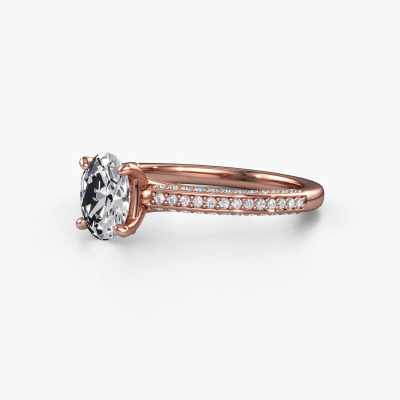 Bovenstaande verlovingsring heeft de naam Elenore ovl. Dit type verlovingsring noemen we een pavé solitaire verlovingsring omdat hij een enkele middensteen heeft waarbij de banden van de verlovingsring ook volgezet zijn. Deze verlovingsring is uitgevoerd in 14 Carat rosé goud en heeft als middensteen een ovale diamant ter grootte van 0.70 crt, en in de zijbanden zijn diamanten gezet. Ieder juweel is gemaakt door een team van gedreven goudsmeden en designers. Hierdoor zal dit unieke pronkstuk een echte eyecatcher zijn.. Deze exclusieve rosé gouden pavé solitaire verlovingsring heeft een schitterende ovale diamant als center steen, waarbij in de band nog meer diamanten zijn gezet om de middensteen nog meer te accentueren. Doordat de zetting van de pootjes om de diamant open is, vangt de diamant het licht van alle kanten op en schittert hierdoor optimaal. Hierboven kun je zien hoe onze goudsmid de verlovingsring heel precies tot in de kleinste details heeft bewerkt, zodat de wat hoger gelegen diamant een echte eyecatcher is. Wat een prachtige verlovingsring om te geven bij je aanzoek aan de liefde van jouw leven, aan jouw stralende middelpunt!Onze goudsmeden vervaardigen pas je Elenore ovl verlovingsring, zodra je deze besteld hebt. We hebben geen voorraden. Het voordeel hiervan is dat we de voorraad niet door hoeven te berekenen in de prijs, en kunnen daardoor sieraden leveren tegen een bijzonder lage prijs.Heb je zelf een specifieke verlovingsring ergens gezien, die je graag aan jouw geliefde zou willen geven? Bespreek gerust jouw ideeën met onze sieradenontwerpers, want wij zetten graag jouw ontwerp om tot een exclusieve verlovingsring. Je kunt tijdens het ontwerpproces steeds meekijken, omdat wij met 3D tekeningen werken. Je krijgt hierdoor al een realistische indruk van hoe jouw ontwerp er in werkelijkheid uit komt te zien. Daarbij kun je een dummy vooraf bestellen. Een dummy is een kunststof ring, die precies dezelfde vormen heeft als jouw uiteindelijke ontwerp. Je kunt deze passen en zien of de breedte en dikte bijvoorbeeld naar wens zijn. Wij sturen je graag een vrijblijvende offerte, waarbij je ongetwijfeld versteld zult staan over de prijs en de kwaliteit van de ring en edelstenen.Om het voor jou makkelijker te maken kun je ieder besteld sieraad binnen 30 dagen na aflevering eenvoudig weer retour sturen.