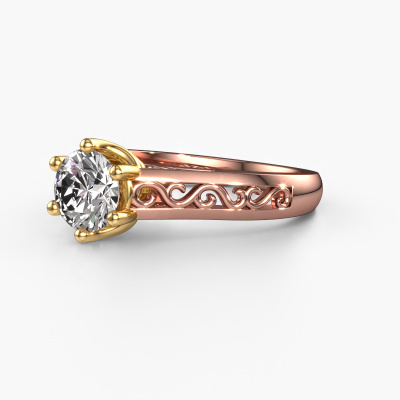 Bovenstaande verlovingsring heeft de naam Shan, dit type verlovingsring noemen we een solitaire ring omdat hij een enkele edelsteen bevat. De verlovingsring is uitgevoerd in 14 Carat rosé goud en heeft een ronde diamant ter grootte van 1.00 crt. Het leuke van onze configurator is dat je zelf je juweel kunt samenstellen tot een eigen persoonlijk juweel. Deze solitaire ring is uitgevoerd in de edelmetaal combinatie rosé goud met goud, maar u kunt dus ook uit andere kleuren kiezen. Ieder juweel is gemaakt door een team van gedreven goudsmeden en designers. Hierdoor zal dit unieke pronkstuk een echte eyecatcher zijn.De solitaire verlovingsring is een bijzondere verlovingsring. Juist doordat de chatonzetting open is, creëert de lichtinval een schitterend effect op de edelsteen. Omdat de gekozen edelsteen hoog op de verlovingsring geplaatst wordt, wordt deze Keltische verlovingsring een prachtige eyecatcher. Met veel zorgvuldigheid vervaardigen wij alle details in deze solitaire verlovingsring met de hand, zodat jij binnenkort je aanzoek kunt bekronen met een unieke ring, speciaal voor de liefde van jouw leven!Door onze modernste technieken kunnen wij met uiterste precisie prachtige sieraden te ontwerpen en voor jou personaliseren in de hoogste juwelierskwaliteit. Tegelijkertijd zijn onze verlovingsringen altijd 30% goedkoper dan bij een andere juwelier. Dit komt doordat alle verlovingsringen pas vervaardigd worden op het moment dat deze besteld wordt en we daardoor geen dure voorraden hoeven te hanteren. Mocht je aan een bepaald budget gebonden zijn, kunnen we je graag adviseren welke combinatie je het beste kunt kiezen.Heb je zelf een specifieke verlovingsring ergens gezien, die je graag aan jouw geliefde zou willen geven? Bespreek gerust jouw ideeën met onze sieradenontwerpers, want wij zetten graag jouw ontwerp om tot een Keltische verlovingsring. Je kunt tijdens het ontwerpproces steeds meekijken, omdat wij met 3D tekeningen werken. Je krijgt hierdoor al een realistische indruk van hoe jouw ontwerp er in werkelijkheid uit komt te zien. Daarbij kun je een dummy vooraf bestellen. Een dummy is een kunststof ring, die precies dezelfde vormen heeft als jouw uiteindelijke ontwerp. Je kunt deze passen en zien of de breedte en dikte bijvoorbeeld naar wens zijn. Wij sturen je graag een vrijblijvende offerte, waarbij je ongetwijfeld versteld zult staan over de prijs en de kwaliteit van de ring en edelstenen.Om het voor jou makkelijker te maken kun je ieder besteld sieraad binnen 30 dagen na aflevering eenvoudig weer retour sturen.