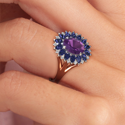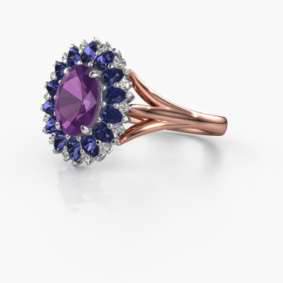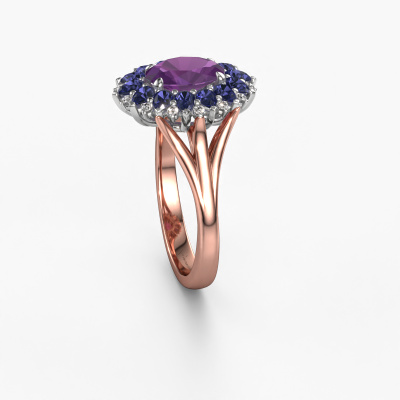 Bovenstaande verlovingsring heeft de naam Lidia. Dit type verlovingsring noemen we een entourage ring. Hierbij worden rondom de middensteen in een open zetting allemaal kleine edelstenen gezet. Deze verlovingsring uitgevoerd in 14 Carat rosé goud heeft een ovale amethist van 8x6 mm als center steen met daaromheen kleine saffier. Wat deze vintage rosé gouden entourage verlovingsring bijzonder maakt, zijn de kleinere edelstenen die rondom de grote amethist zijn gezet in de vorm van een prachtige bloem. Hierdoor lijkt het één grote fonkelende edelsteen te vormen. Een andere naam voor deze verlovingsring is hierdoor ook wel de flower of de rozet ring. Deze kleinere saffier moeten dan echter wel allen op dezelfde manier geplaatst zijn, zodat het licht niet onderbroken wordt in de amethist en er inderdaad een prachtige eenheid gecreëerd wordt. En daar zorgen onze meestergoudsmeden voor. Met uiterste precisie wordt iedere zorgvuldig geselecteerde amethist met de hand in de verlovingsring geplaatst. Steeds opnieuw wordt de verlovingsring onder de loep gehouden om te zien of het speciale effect nog steeds zichtbaar is. Het resultaat is een unieke verlovingsring, waarbij de gekozen amethist letterlijk het stralende middelpunt wordt. Je kunt je voorstellen dat deze verlovingsring werkelijk een betekenisvolle verlovingsring is om aan jouw liefde voor het leven te schenken! Op de dag dat jij laat zien dat zij jouw stralende middelpunt is! Dit juweel wordt met passie en liefde gemaakt door één van onze meestergoudsmeden.Door het gebruik van de modernste technieken, gecombineerd met ambachtelijk vakmanschap kunnen wij alle verlovingsringen zelf in ons atelier maken. Ieder sieraad wordt pas gemaakt nadat deze besteld is. Dit heeft als bijkomend voordeel dat we kunnen leveren tegen een prijs die je nergens anders tegenkomt.Heb je zelf een specifieke verlovingsring ergens gezien, die je graag aan jouw geliefde zou willen geven? Bespreek gerust jouw ideeën met onze sieradenontwerpers, want wij zetten graag jouw ontwerp om tot een vintage verlovingsring. Je kunt tijdens het ontwerpproces steeds meekijken, omdat wij met 3D tekeningen werken. Je krijgt hierdoor al een realistische indruk van hoe jouw ontwerp er in werkelijkheid uit komt te zien. Daarbij kun je een dummy vooraf bestellen. Een dummy is een kunststof ring, die precies dezelfde vormen heeft als jouw uiteindelijke ontwerp. Je kunt deze passen en zien of de breedte en dikte bijvoorbeeld naar wens zijn. Wij sturen je graag een vrijblijvende offerte, waarbij je ongetwijfeld versteld zult staan over de prijs en de kwaliteit van de ring en edelstenen.Om het voor jou makkelijker te maken kun je ieder besteld sieraad binnen 30 dagen na aflevering eenvoudig weer retour sturen.