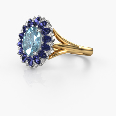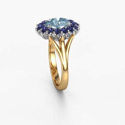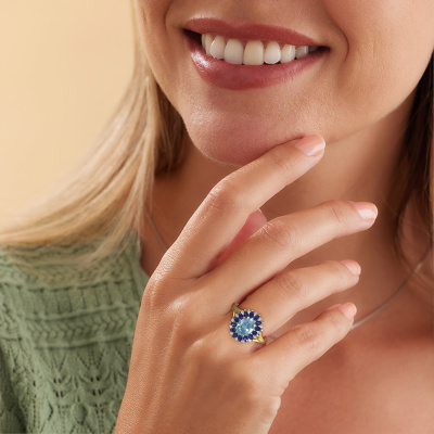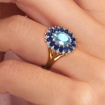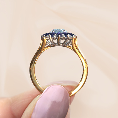 Bovenstaande verlovingsring heeft de naam Lidia. Dit type verlovingsring noemen we een entourage ring. Hierbij worden rondom de middensteen in een open zetting allemaal kleine edelstenen gezet. Deze verlovingsring uitgevoerd in 14 Carat goud heeft een ovale blauwe lab grown diamant van 8x6 mm als center steen met daaromheen kleine saffier. Wat deze vintage gouden entourage verlovingsring bijzonder maakt, zijn de kleinere edelstenen die rondom de grote blauwe lab grown diamant zijn gezet in de vorm van een prachtige bloem. Hierdoor lijkt het één grote fonkelende edelsteen te vormen. Een andere naam voor deze verlovingsring is hierdoor ook wel de flower of de rozet ring. Deze kleinere saffier moeten dan echter wel allen op dezelfde manier geplaatst zijn, zodat het licht niet onderbroken wordt in de blauwe lab grown diamant en er inderdaad een prachtige eenheid gecreëerd wordt. En daar zorgen onze meestergoudsmeden voor. Met uiterste precisie wordt iedere zorgvuldig geselecteerde blauwe lab grown diamant met de hand in de verlovingsring geplaatst. Steeds opnieuw wordt de verlovingsring onder de loep gehouden om te zien of het speciale effect nog steeds zichtbaar is. Het resultaat is een unieke verlovingsring, waarbij de gekozen blauwe lab grown diamant letterlijk het stralende middelpunt wordt. Je kunt je voorstellen dat deze verlovingsring werkelijk een betekenisvolle verlovingsring is om aan jouw liefde voor het leven te schenken! Op de dag dat jij laat zien dat zij jouw stralende middelpunt is! Dit juweel wordt met passie en liefde gemaakt door één van onze meestergoudsmeden.Door het gebruik van de modernste technieken, gecombineerd met ambachtelijk vakmanschap kunnen wij alle verlovingsringen zelf in ons atelier maken. Ieder sieraad wordt pas gemaakt nadat deze besteld is. Dit heeft als bijkomend voordeel dat we kunnen leveren tegen een prijs die je nergens anders tegenkomt.Heb je zelf een specifieke verlovingsring ergens gezien, die je graag aan jouw geliefde zou willen geven? Bespreek gerust jouw ideeën met onze sieradenontwerpers, want wij zetten graag jouw ontwerp om tot een vintage verlovingsring. Je kunt tijdens het ontwerpproces steeds meekijken, omdat wij met 3D tekeningen werken. Je krijgt hierdoor al een realistische indruk van hoe jouw ontwerp er in werkelijkheid uit komt te zien. Daarbij kun je een dummy vooraf bestellen. Een dummy is een kunststof ring, die precies dezelfde vormen heeft als jouw uiteindelijke ontwerp. Je kunt deze passen en zien of de breedte en dikte bijvoorbeeld naar wens zijn. Wij sturen je graag een vrijblijvende offerte, waarbij je ongetwijfeld versteld zult staan over de prijs en de kwaliteit van de ring en edelstenen.Om het voor jou makkelijker te maken kun je ieder besteld sieraad binnen 30 dagen na aflevering eenvoudig weer retour sturen.
