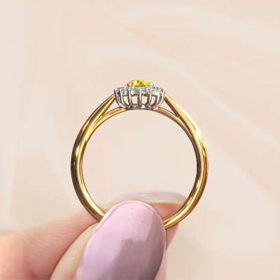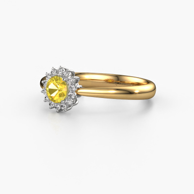 Bovenstaande verlovingsring heeft de naam Tilly RND 1. Dit type verlovingsring noemen we een entourage ring. Hierbij worden rondom de middensteen in een open zetting allemaal kleine edelstenen gezet. Deze verlovingsring uitgevoerd in 14 Carat goud heeft een ronde gele saffier van 4.2 mm als center steen met daaromheen kleine diamanten. Wat deze klassieke gouden entourage verlovingsring bijzonder maakt, zijn de kleinere edelstenen die rondom de grote gele saffier zijn gezet in de vorm van een prachtige bloem. Hierdoor lijkt het één grote fonkelende edelsteen te vormen. Een andere naam voor deze verlovingsring is hierdoor ook wel de flower of de rozet ring. Deze kleinere diamanten moeten dan echter wel allen op dezelfde manier geplaatst zijn, zodat het licht niet onderbroken wordt in de gele saffier en er inderdaad een prachtige eenheid gecreëerd wordt. En daar zorgen onze meestergoudsmeden voor. Met uiterste precisie wordt iedere zorgvuldig geselecteerde gele saffier met de hand in de verlovingsring geplaatst. Steeds opnieuw wordt de verlovingsring onder de loep gehouden om te zien of het speciale effect nog steeds zichtbaar is. Het resultaat is een unieke verlovingsring, waarbij de gekozen gele saffier letterlijk het stralende middelpunt wordt. Je kunt je voorstellen dat deze verlovingsring werkelijk een betekenisvolle verlovingsring is om aan jouw liefde voor het leven te schenken! Op de dag dat jij laat zien dat zij jouw stralende middelpunt is! Dit juweel is gemaakt om aan jouw vinger te stralen, ieder sieraad wordt met liefde door onze goudsmeden met de hand gemaakt.Door het gebruik van de modernste technieken, gecombineerd met ambachtelijk vakmanschap kunnen wij alle verlovingsringen zelf in ons atelier maken. Ieder sieraad wordt pas gemaakt nadat deze besteld is. Dit heeft als bijkomend voordeel dat we kunnen leveren tegen een prijs die je nergens anders tegenkomt.Ons team is iedere dag weer bezig om nieuwe ontwerpen toe te voegen, in samenwerking met onze designers en goudsmeden wordt gekeken hoe we tot het mooiste ontwerp kunnen komen. Wij doen ons best om tot een zo gevarieerd mogelijk aanbod te komen. Wellicht heb je zelf al een mooi idee van een sieraad dat je ooit wel eens gezien hebt. Neem dan eens vrijblijvend contact met ons op. Wij maken een offerte voor je op waarbij wij vrij zeker zijn dat we wat betreft kwaliteit en prijs jou versteld zullen laten staan.Om het voor jou makkelijker te maken kun je ieder besteld sieraad binnen 30 dagen na aflevering eenvoudig weer retour sturen.
