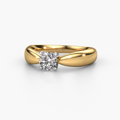 Bovenstaande verlovingsring heeft de naam Nichole. Dit type verlovingsring noemen we een solitaire verlovingsring omdat hij een enkele edelsteen bevat. De verlovingsring is uitgevoerd in 14 Carat goud en heeft een ronde diamant ter grootte van 0.40 crt. Deze schitterende fantasie gouden solitaire ring heeft een prachtige ronde diamant om je aanzoek heel speciaal te maken. De open chatonzetting zorgt voor een prachtige lichtinval op de diamant. Wist je dat de diamant bijvoorbeeld symbool staat voor eeuwige liefde en trouw? Juist daarom is het een prachtige edelsteen om in het middelpunt te stellen. Onze goudsmid plaatst met veel zorgvuldigheid de gekozen edelsteen hoog op de ring, waardoor het een echte eyecatcher is. Ieder juweel wordt speciaal voor jou gemaakt door onze meester goudsmeden in ons eigen atelier.Wist je dat we een beste prijs garantie geven voor jouw verlovingsring? Dit is mogelijk omdat al onze sieraden met de hand gemaakt worden in ons eigen atelier. We hebben geen dure voorraden, en we maken pas je verlovingsring op het moment dat je besteld hebt. Doordat we de hele productie zelf in de hand hebben, kunnen wij je goed informeren over alle eigenschappen van deze ring. Juist omdat het kopen van een verlovingsring online spannend is, begrijpen wij dat het fijn is om alle kenmerken te weten van jouw ring.Heb je zelf een speciale ring in gedachten, die je wellicht ergens gezien hebt? Je kunt je ideeën altijd met ons bespreken, wij zetten graag jouw ontwerp om tot een unieke verlovingsring. Het ontwerp kun je volgen, omdat wij met 3D tekeningen werken. Hierdoor krijg je al een realistische indruk van hoe jouw ontwerp er in het echt uit komt te zien. Wij sturen je graag een vrijblijvende offerte, waarbij je ongetwijfeld verwonderd zult zijn over de prijs in combinatie met de uitstekende kwaliteit die we aanbieden.Om het voor jou makkelijker te maken kun je ieder besteld sieraad binnen 30 dagen na aflevering eenvoudig weer retour sturen.