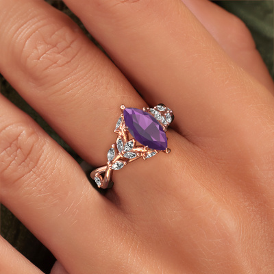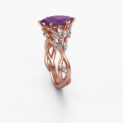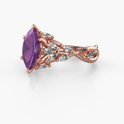 Deze verlovingsring heeft de naam Samantha MRQ. Deze gracieuze verlovingsring uitgevoerd, in 14 Carat rosé goud is gezet met 11x5.5 mm amethist. Deze exclusieve rosé gouden flower verlovingsring is een puur staaltje vakmanschap! Alle kleine details zijn door onze goudsmid met veel geduld en passie vervaardigd. Dit ambacht vraagt een deskundig oog en vaardige hand om deze verlovingsring met uiterste precisie samen te stellen. En dat is precies waar onze goudsmeden enthousiast van worden! De prachtige amethisten zijn op een bijzondere manier gezet, zodat deze nog beter tot zijn recht komen. Dit geeft de verlovingsring extra allure. De verlovingsring is al uniek door zijn natuurlijke edelsteen, die we speciaal geselecteerd hebben voor deze ring. Daarnaast kun je zelf de samenstelling kiezen van het edelmetaal, waardoor je uiteindelijk een unieke verlovingsring hebt gecreëerd voor de meest exclusieve vrouw in je leven! Dit juweel is gemaakt om aan je vinger te stralen, ieder sieraad wordt met liefde door onze goudsmeden met de hand gemaakt.Door het gebruik van de modernste technieken, gecombineerd met ambachtelijk vakmanschap kunnen wij alle verlovingsringen zelf in ons atelier maken. Ieder sieraad wordt pas gemaakt nadat deze besteld is. Dit heeft als bijkomend voordeel dat we kunnen leveren tegen een prijs die je nergens anders tegenkomt.Ons team is iedere dag weer bezig om nieuwe ontwerpen toe te voegen, in samenwerking met onze designers en goudsmeden wordt gekeken hoe we tot het mooiste ontwerp kunnen komen. Wij doen ons best om tot een zo gevarieerd mogelijk aanbod te komen. Wellicht heb je zelf al een mooi idee van een sieraad dat je ooit wel eens gezien hebt. Neem dan eens vrijblijvend contact met ons op. Wij maken een offerte voor je op waarbij wij vrij zeker zijn dat we wat betreft kwaliteit en prijs jou versteld zullen laten staan.Om het voor jou makkelijker te maken kun je ieder besteld sieraad binnen 30 dagen na aflevering eenvoudig weer retour sturen.