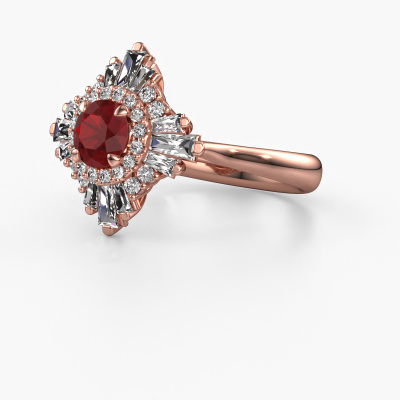 Deze verlovingsring heeft de naam Thalia. Deze ring, uitgevoerd in 14 Carat rosé goud is gezet met 5.4 mm robijn. Een bijzondere rosé gouden vintage ring, deze unieke verlovingsring die jouw liefde van je leven zeker laat stralen! En dat is precies waar wij voor gaan. In deze vintage verlovingsring is prachtige robijn verwerkt. Je kunt natuurlijk iedere edelsteen die wij aanbieden hierin laten verwerken. De edelsteen is zorgvuldig geselecteerd, want wij vinden dat op jouw bijzondere verlovingsring alleen de mooiste edelsteen mag schitteren, toch? Onze goudsmid vervaardigt jouw verlovingsring in ons eigen atelier, en plaatst de robijn met uiterste precisie in de ring. Vervolgens wordt deze bijgewerkt en gepolijst totdat het resultaat zichtbaar is: de perfecte verlovingsring voor de liefde van jouw leven! Dit juweel wordt met passie en liefde gemaakt door één van onze meestergoudsmeden.Wist je dat we een beste prijs garantie geven voor jouw verlovingsring? Dit is mogelijk omdat al onze sieraden met de hand gemaakt worden in ons eigen atelier. We hebben geen dure voorraden, en we maken pas je verlovingsring op het moment dat je besteld hebt. Doordat we de hele productie zelf in de hand hebben, kunnen wij je goed informeren over alle eigenschappen van deze ring. Juist omdat het kopen van een verlovingsring online spannend is, begrijpen wij dat het fijn is om alle kenmerken te weten van jouw ring.Heb je zelf een specifieke verlovingsring ergens gezien, die je graag aan jouw geliefde zou willen geven? Bespreek gerust jouw ideeën met onze sieradenontwerpers, want wij zetten graag jouw ontwerp om tot een vintage verlovingsring. Je kunt tijdens het ontwerpproces steeds meekijken, omdat wij met 3D tekeningen werken. Je krijgt hierdoor al een realistische indruk van hoe jouw ontwerp er in werkelijkheid uit komt te zien. Daarbij kun je een dummy vooraf bestellen. Een dummy is een kunststof ring, die precies dezelfde vormen heeft als jouw uiteindelijke ontwerp. Je kunt deze passen en zien of de breedte en dikte bijvoorbeeld naar wens zijn. Wij sturen je graag een vrijblijvende offerte, waarbij je ongetwijfeld versteld zult staan over de prijs en de kwaliteit van de ring en edelstenen.Om het voor jou makkelijker te maken kun je ieder besteld sieraad binnen 30 dagen na aflevering eenvoudig weer retour sturen.