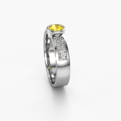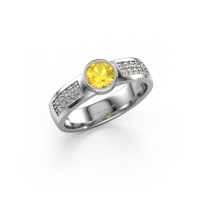 Bovenstaande verlovingsring heeft de naam Ise 3. Dit type verlovingsring noemen we een pavé solitaire verlovingsring omdat hij een enkele middensteen heeft waarbij de banden van de verlovingsring ook volgezet zijn. De verlovingsring is uitgevoerd in de combinatie platina met platina en heeft als middensteen een ronde gele saffier ter grootte van 4.7 mm en in de zijbanden zijn diamanten gezet. Ieder juweel wordt speciaal voor jou gemaakt door onze meester goudsmeden in ons eigen atelier.Deze moderne platina pavé solitaire verlovingsring heeft een schitterende ronde gele saffier als centersteen, waarbij in de band nog meer gele saffier zijn gezet om de middensteen nog meer te accentueren. Doordat de zetting van de pootjes om de gele saffier open is, vangt de gele saffier het licht van alle kanten op en schittert hierdoor optimaal. Hierboven kun je zien hoe onze goudsmid de verlovingsring heel precies tot in de kleinste details heeft bewerkt, zodat de wat hoger gelegen gele saffier een echte eyecatcher is. Wat een prachtige verlovingsring om te geven bij je aanzoek aan de liefde van jouw leven, aan jouw stralende middelpunt!Omdat wij zelf alle verlovingsring maken en direct aan jou leveren kunnen wij je een verlovingsring leveren tegen een prijs die je nergens anders zult tegenkomen. Een ring wordt pas gemaakt als we een bestelling krijgen, hierdoor hebben wij geen dure voorraden en kunnen wij je de beste prijs garanderen. Wij begrijpen dat het kopen van een verlovingsring online spannend is en willen daarom je zoveel mogelijk informeren over alle specifieke eigenschappen van de ring die jij koopt.Ons team is iedere dag weer bezig om nieuwe ontwerpen toe te voegen, in samenwerking met onze designers en goudsmeden wordt gekeken hoe we tot het mooiste ontwerp kunnen komen. Wij doen ons best om tot een zo gevarieerd mogelijk aanbod te komen. Wellicht heb je zelf al een mooi idee van een sieraad dat je ooit wel eens gezien hebt. Neem dan eens vrijblijvend contact met ons op. Wij maken een offerte voor je op waarbij wij vrij zeker zijn dat we wat betreft kwaliteit en prijs jou versteld zullen laten staan.Om het voor jou makkelijker te maken kun je ieder besteld sieraad binnen 30 dagen na aflevering eenvoudig weer retour sturen.