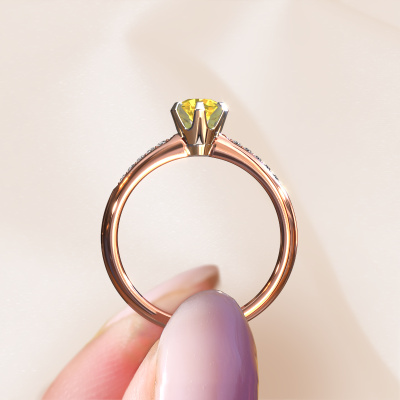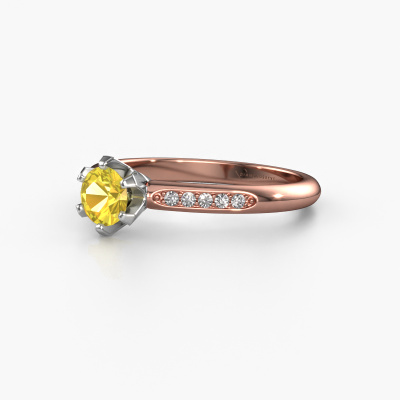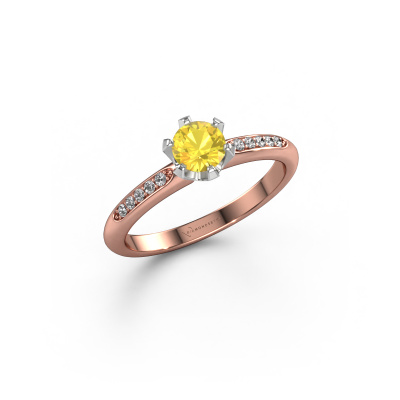 Bovenstaande verlovingsring heeft de naam Tiffy 2. Dit type verlovingsring noemen we een pavé solitaire verlovingsring omdat hij een enkele middensteen heeft waarbij de banden van de verlovingsring ook volgezet zijn. Deze verlovingsring is uitgevoerd in 14 Carat rosé goud en heeft als middensteen een ronde gele saffier ter grootte van 4.7 mm, en in de zijbanden zijn diamanten gezet. Ieder juweel is gemaakt om aan je vinger te stralen, ieder sieraad wordt met liefde door onze goudsmeden met de hand gemaakt.. Deze traditionele rosé gouden pavé solitaire verlovingsring heeft een schitterende ronde gele saffier als center steen, waarbij in de band nog meer diamanten zijn gezet om de middensteen nog meer te accentueren. Doordat de zetting van de pootjes om de gele saffier open is, vangt de gele saffier het licht van alle kanten op en schittert hierdoor optimaal. Hierboven kun je zien hoe onze goudsmid de verlovingsring heel precies tot in de kleinste details heeft bewerkt, zodat de wat hoger gelegen gele saffier een echte eyecatcher is. Wat een prachtige verlovingsring om te geven bij je aanzoek aan de liefde van jouw leven, aan jouw stralende middelpunt!Door onze modernste technieken kunnen wij met uiterste precisie prachtige sieraden te ontwerpen en voor jou personaliseren in de hoogste juwelierskwaliteit. Tegelijkertijd zijn onze verlovingsringen altijd 30% goedkoper dan bij een andere juwelier. Dit komt doordat alle verlovingsringen pas vervaardigd worden op het moment dat deze besteld wordt en we daardoor geen dure voorraden hoeven te hanteren. Mocht je aan een bepaald budget gebonden zijn, kunnen we je graag adviseren welke combinatie je het beste kunt kiezen.Iedere dag is ons team van goudsmeden en sieradenontwerpers aan het werk om nieuwe sieraden te creëren. Het kan zijn dat je ergens een traditionele verlovingsring gezien hebt, die je als basis wilt nemen bij het ontwerpen van jouw unieke ring. Neem gerust contact met ons op en we zullen je een aanbod doen, waar je vrijwel zeker verwonderd zult zijn over de kwaliteit en de prijs.Om het voor jou makkelijker te maken kun je ieder besteld sieraad binnen 30 dagen na aflevering eenvoudig weer retour sturen.