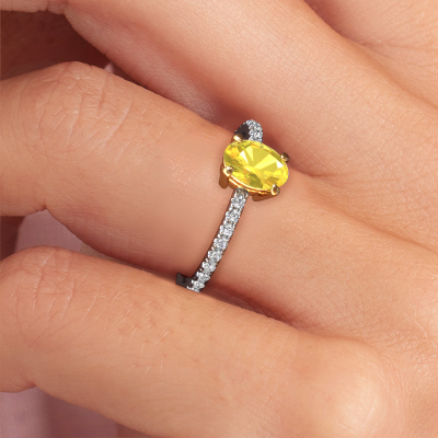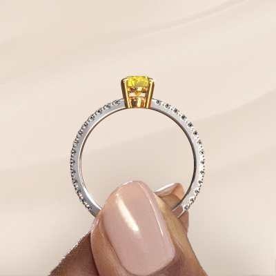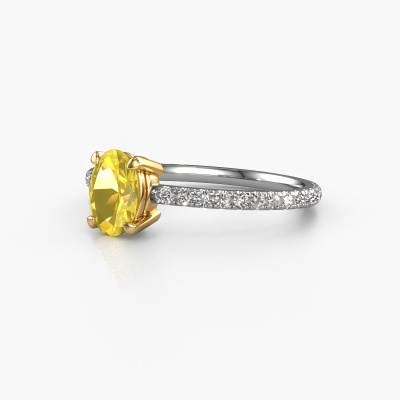 Bovenstaande verlovingsring heeft de naam Lynelle 2. Dit type verlovingsring noemen we een pavé solitaire verlovingsring omdat hij een enkele middensteen heeft waarbij de banden van de verlovingsring ook volgezet zijn. Deze verlovingsring is uitgevoerd in 14 Carat witgoud en heeft als middensteen een ovale gele saffier ter grootte van 7x5 mm, en in de zijbanden zijn diamanten gezet. Ieder juweel is gemaakt om aan je vinger te stralen, ieder sieraad wordt met liefde door onze goudsmeden met de hand gemaakt.. Deze klassieke witgouden pavé solitaire verlovingsring heeft een schitterende ovale gele saffier als center steen, waarbij in de band nog meer diamanten zijn gezet om de middensteen nog meer te accentueren. Doordat de zetting van de pootjes om de gele saffier open is, vangt de gele saffier het licht van alle kanten op en schittert hierdoor optimaal. Hierboven kun je zien hoe onze goudsmid de verlovingsring heel precies tot in de kleinste details heeft bewerkt, zodat de wat hoger gelegen gele saffier een echte eyecatcher is. Wat een prachtige verlovingsring om te geven bij je aanzoek aan de liefde van jouw leven, aan jouw stralende middelpunt!Onze goudsmeden vervaardigen pas je Lynelle 2 verlovingsring, zodra je deze besteld hebt. We hebben geen voorraden. Het voordeel hiervan is dat we de voorraad niet door hoeven te berekenen in de prijs, en kunnen daardoor sieraden leveren tegen een bijzonder lage prijs.Heb je zelf een speciale ring in gedachten, die je wellicht ergens gezien hebt? Je kunt je ideeën altijd met ons bespreken, wij zetten graag jouw ontwerp om tot een unieke verlovingsring. Het ontwerp kun je volgen, omdat wij met 3D tekeningen werken. Hierdoor krijg je al een realistische indruk van hoe jouw ontwerp er in het echt uit komt te zien. Wij sturen je graag een vrijblijvende offerte, waarbij je ongetwijfeld verwonderd zult zijn over de prijs in combinatie met de uitstekende kwaliteit die we aanbieden.Om het voor jou makkelijker te maken kun je ieder besteld sieraad binnen 30 dagen na aflevering eenvoudig weer retour sturen.