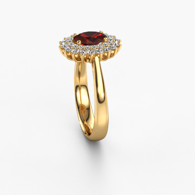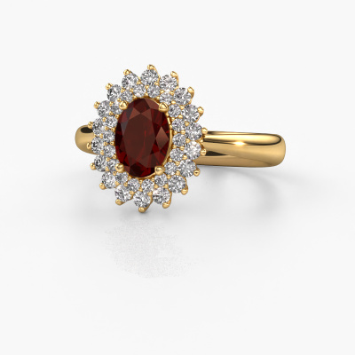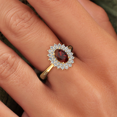 Bovenstaande verlovingsring heeft de naam Alina 1. Dit type verlovingsring noemen we een entourage ring, hierbij worden rondom de middensteen in een open zetting allemaal kleine edelstenen gezet. Deze verlovingsring uitgevoerd in 14 Carat goud heeft een ovale granaat van 7x5 mm als center steen met daaromheen kleine diamanten. Het opvallende aan deze klassieke gouden entourage verlovingsring is de vorm: de kleine edelstenen vormen samen met de granaat een prachtige bloem, die lijkt samen te smelten tot één fonkelende edelsteen. Deze verlovingsring wordt ook wel de flower of de rozet verlovingsring genoemd. Onze meestergoudsmeden zorgen ervoor dat de kleinere diamanten allen op dezelfde manier geplaatst worden, zodat het licht niet onderbroken wordt in de granaat en er inderdaad een prachtige eenheid gecreëerd wordt. Met een geoefend oog en een vaardige hand wordt iedere zorgvuldig geselecteerde granaat in de verlovingsring geplaatst. Steeds opnieuw wordt de verlovingsring onder de loep gehouden om te zien of het speciale effect nog steeds zichtbaar is. Het resultaat is een unieke verlovingsring, waarbij de gekozen granaat letterlijk het stralende middelpunt wordt. Wat een prachtige, betekenisvolle verlovingsring om te geven aan het stralende middelpunt in jouw leven! Wellicht is het je opgevallen dat onze prijzen gemiddeld 30% lager liggen dan bij een andere juwelier. En dat terwijl de kwaliteit in de meeste gevallen nog beter is! Dit komt doordat onze goudsmeden je verlovingsring direct in ons eigen atelier vervaardigen. Hierdoor hoeven we geen dure voorraden te hanteren en kunnen we ieder gewenst detail direct op jouw verlovingsring aanbrengen.Iedere dag is ons team van goudsmeden en sieradenontwerpers aan het werk om nieuwe sieraden te creëren. Het kan zijn dat je ergens een klassieke verlovingsring gezien hebt, die je als basis wilt nemen bij het ontwerpen van jouw unieke ring. Neem gerust contact met ons op en we zullen je een aanbod doen, waar je vrijwel zeker verwonderd zult zijn over de kwaliteit en de prijs.Om het voor jou makkelijker te maken kun je ieder besteld sieraad binnen 30 dagen na aflevering eenvoudig weer retour sturen.