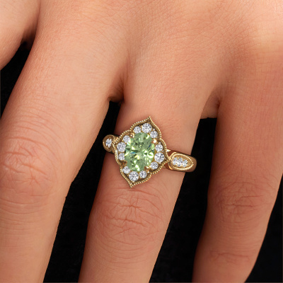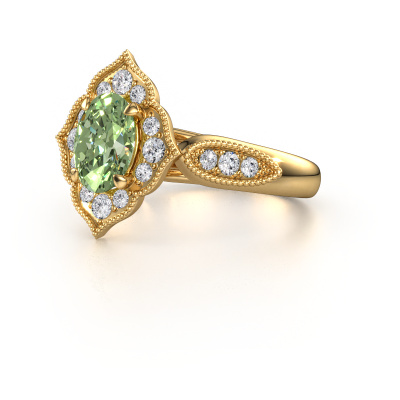 Deze verlovingsring heeft de naam Rosan. Deze verlovingsring uitgevoerd in 14 Carat goud is gezet met groene lab grown diamant. Een bijzondere gouden vintage ring, deze unieke verlovingsring die jouw liefde van je leven zeker laat stralen! En dat is precies waar wij voor gaan. In deze vintage verlovingsring zijn prachtige groene lab grown diamanten verwerkt. Je kunt natuurlijk iedere edelsteen die wij aanbieden hierin laten verwerken. De edelsteen is zorgvuldig geselecteerd, want wij vinden dat op jouw verlovingsring alleen de mooiste edelsteen mag schitteren, toch? Onze goudsmid vervaardigt jouw verlovingsring in ons eigen atelier, en plaatst de groene lab grown diamant met uiterste precisie in de ring. Vervolgens wordt deze bijgewerkt en gepolijst totdat het resultaat zichtbaar is: de perfecte verlovingsring voor de liefde van jouw leven! Dit juweel wordt speciaal voor jou gemaakt door onze meester goudsmeden in ons eigen atelier.Wist je dat we een beste prijs garantie geven voor jouw verlovingsring? Dit is mogelijk omdat al onze sieraden met de hand gemaakt worden in ons eigen atelier. We hebben geen dure voorraden, en we maken pas je verlovingsring op het moment dat je besteld hebt. Doordat we de hele productie zelf in de hand hebben, kunnen wij je goed informeren over alle eigenschappen van deze ring. Juist omdat het kopen van een verlovingsring online spannend is, begrijpen wij dat het fijn is om alle kenmerken te weten van jouw ring.Ons team is iedere dag weer bezig om nieuwe ontwerpen toe te voegen, in samenwerking met onze designers en goudsmeden wordt gekeken hoe we tot het mooiste ontwerp kunnen komen. Wij doen ons best om tot een zo gevarieerd mogelijk aanbod te komen. Wellicht heb je zelf al een mooi idee van een sieraad dat je ooit wel eens gezien hebt. Neem dan eens vrijblijvend contact met ons op. Wij maken een offerte voor je op waarbij wij vrij zeker zijn dat we wat betreft kwaliteit en prijs jou versteld zullen laten staan.Om het voor jou makkelijker te maken kun je ieder besteld sieraad binnen 30 dagen na aflevering eenvoudig weer retour sturen.
